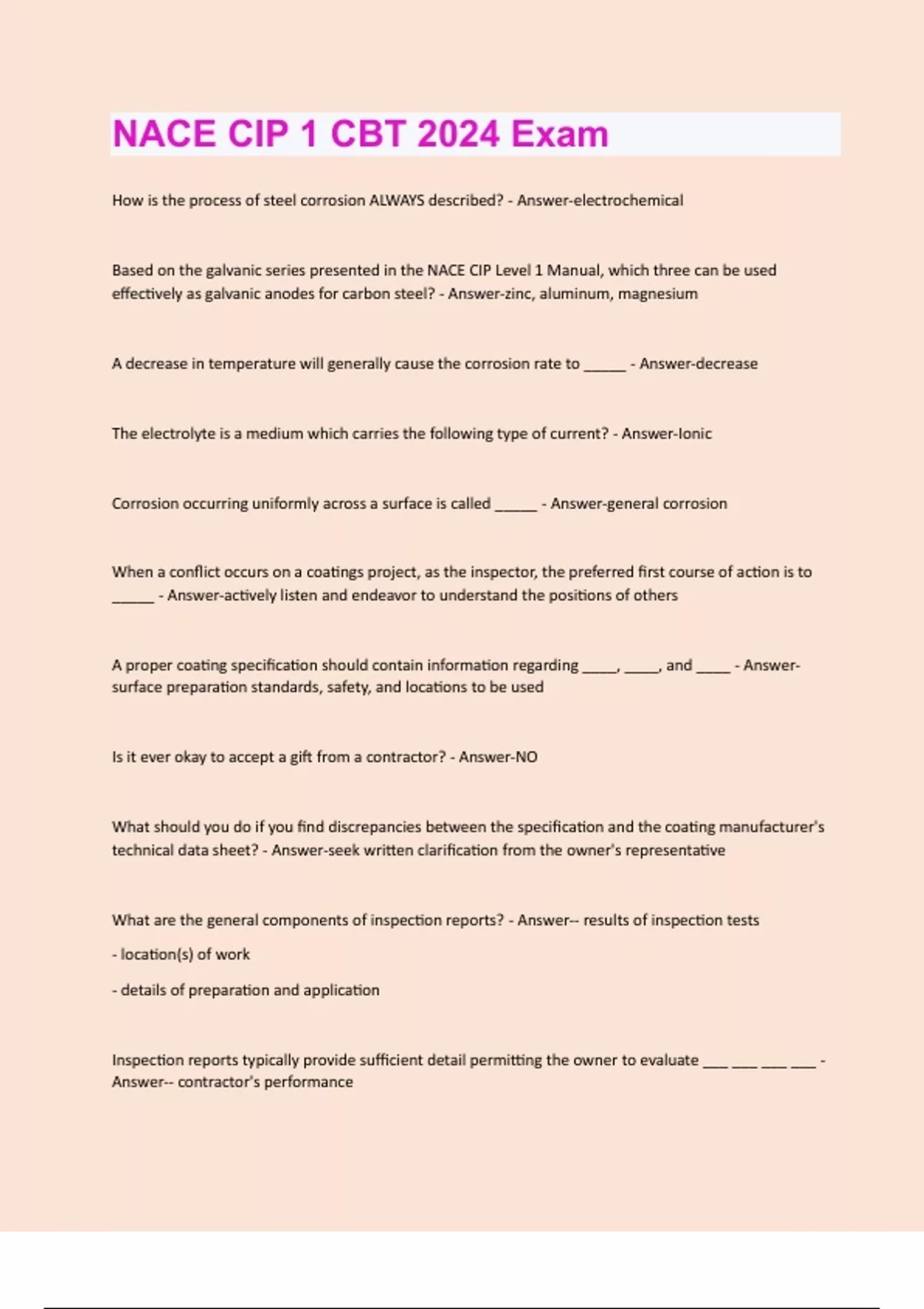 How is the process of steel corrosion ALWAYS described? - Answer-electrochemical Based on the galvanic series presented in the NACE CIP Level 1 Manual, which three can be used effectively as galvanic anodes for carbon steel? - Answer-zinc, aluminum, magnesium A decrease in temperature will generally cause the corrosion rate to _____ - Answer-decrease The electrolyte is a medium which carries the following type of current? - Answer-Ionic Corrosion occurring uniformly across a surface is called _____ - Answer-general corrosion When a conflict occurs on a coatings project, as the inspector, the preferred first course of action is to _____ - Answer-actively listen and endeavor to understand the positions of others A proper coating specification should contain information regarding ____, ____, and ____ - Answersurface preparation standards, safety, and locations to be used Is it ever okay to accept a gift from a contractor? - Answer-NO What should you do if you find discrepancies between the specification and the coating manufacturer's technical data sheet? - Answer-seek written clarification from the owner's representative What are the general components of inspection reports? - Answer-- results of inspection tests - location(s) of work - details of preparation and application Inspection reports typically provide sufficient detail permitting the owner to evaluate ___ ___ ___ ___ - Answer-- contractor's performance- inspector's performance - job progress - work interruptions As an inspector headed to the job site for the first time, where would you always find instruction regarding appropriate types of PPE? - Answer-Safety Data Sheet (SDS), previously called MSDS Materials inventory report should contain which of the following? - Answer-- quantity of each component of each material onsite - material batch numbers - date of materials arrival at job site and storage information The primary function of the coating inspector is _____ - Answer-specification compliance High humidity in the air during coating application can cause _____ - Answer-solvent entrapment