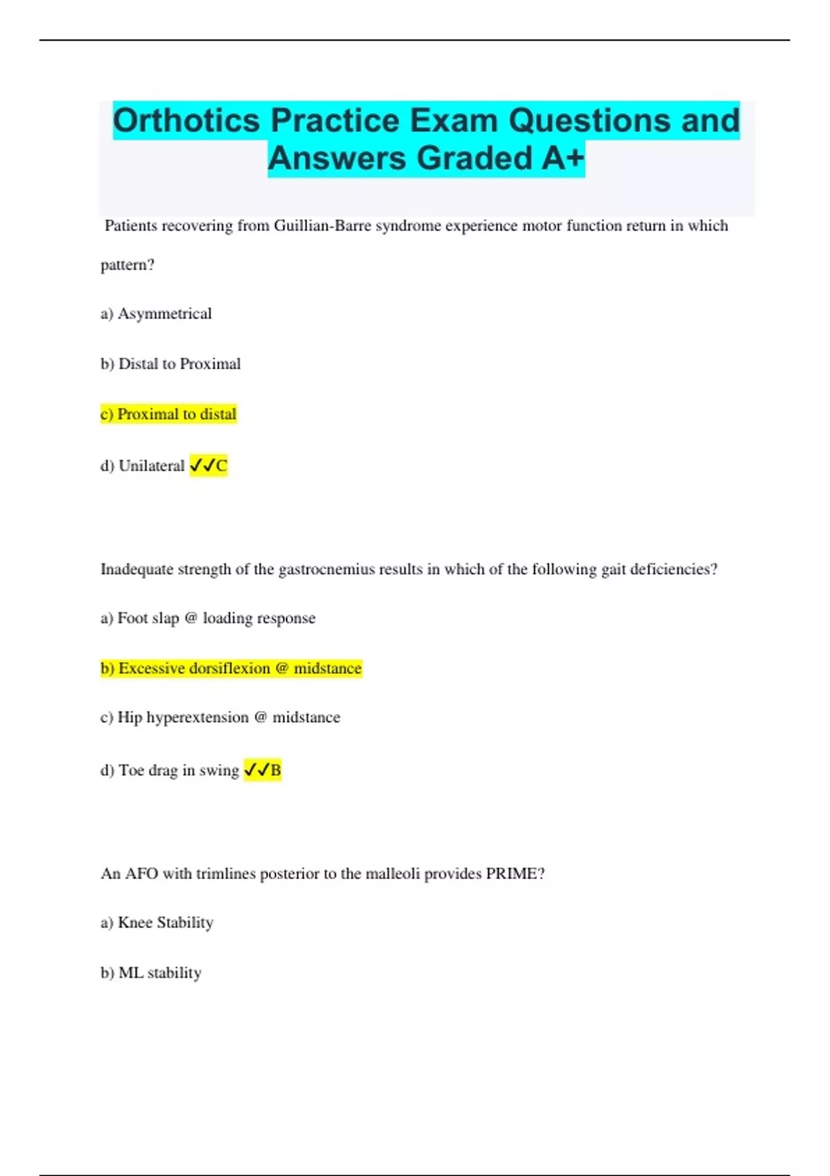 Orthotics Practice Exam Questions and Answers Graded A+ Patients recovering from Guillian-Barre syndrome experience motor function return in which pattern? a) Asymmetrical b) Distal to Proximal c) Proximal to distal d) Unilateral C Inadequate strength of the gastrocnemius results in which of the following gait deficiencies? a) Foot slap @ loading response b) Excessive dorsiflexion @ midstance c) Hip hyperextension @ midstance d) Toe drag in swing B An AFO with trimlines posterior to the malleoli provides PRIME? a) Knee Stability b) ML stability c) Talocrural stability d) Passive dorsiflexion assist D A hospital calls a practitioner to say that a patient who was fit with a device is bringing legal action against the hospital. The suit does not involve the device or the fitting. However the hospital is requesting the practitioner's records regarding the patient. The practitioner should? a) Advise the hospital that the patient records can be released only after receipt of properly signed release forms or a subpoena. b) Send the records to the hospital c) Contac the patient, advise the patient of the conversation with the hospital and ask permission to send the records. d) Send the records only after a written request from the hospital administration A Standard tightening value of halo skull pins for an adult a) 4in-lb b) 5in-lb c) 8in-lb d) 10in-lb C A KOs for OA is designed to? a) Stabilize the tibia under the femur in the sagittal plane b) Distract the joint surface of the medial or lateral compartment c) Enhance patellar tracking 2 d) Compress the soft tissue around the knee B Atlantoaxial instability is common with which of the following? a) Osteoporosis b) Rheumatoid arthritis c) MS d) Ankylosing spondylitis B The functions of the tibialis anterior muscle are: a) Dorsiflexion and inversion b) Dorsiflexion and eversion c) Plantar flexion and inversion d) Plantarflexion and eversion A Excessive knee flexion when standing in a locked metal KAFO results when? a) Proximal thigh band is too shallow b) Distal thigh band is too deep c) Calf band is too shallow d) Calf band is too deep C Poliomyelitis results from an acute viral infection of the: a) Cerebral spinal fluid b) Dura matter of the spinal cord c) Anterior horn cells d) Schwann cells C When fitting a thermoplastic AFO, which of the following helps diminish a moment at heel strike? a) Decreasing heel height of shoe b) Remaking he AFO with increased dorsiflexion c) Increasing the height of the posterior proximal trim line d) Adding a 1⁄4" (6mm) heel lift A