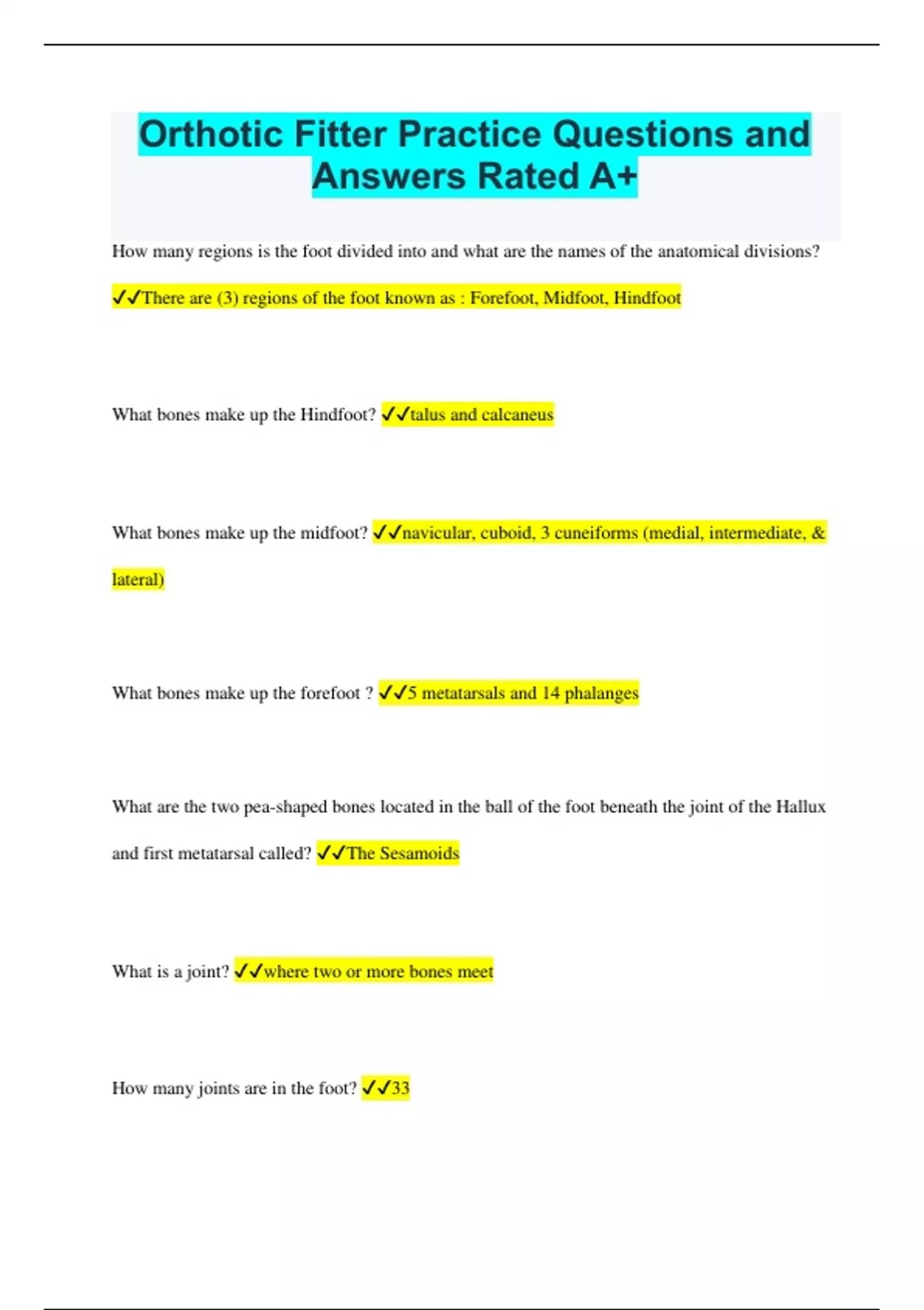 Orthotic Fitter Practice Questions and Answers Rated A+ How many regions is the foot divided into and what are the names of the anatomical divisions? There are (3) regions of the foot known as : Forefoot, Midfoot, Hindfoot What bones make up the Hindfoot? talus and calcaneus What bones make up the midfoot? navicular, cuboid, 3 cuneiforms (medial, intermediate, & lateral) What bones make up the forefoot ? 5 metatarsals and 14 phalanges What are the two pea-shaped bones located in the ball of the foot beneath the joint of the Hallux and first metatarsal called? The Sesamoids What is a joint? where two or more bones meet How many joints are in the foot? 33 What joints makeup the hindfood & midfoot? Ankle Joint, Subtalar joints and the Transverse tarsal joints. What is another name for the ankle joint? talocrural joint What is the MAJOR JOINT in the hindfoot as well as the largest joint in the entire foot called? the Subtalar Joint (also referred to as the talocalcaneal joint) Describe the Transverse tarsal joints? Transverse tarsal joints (aka Midtarsal and Choparts joint) is made up of two joints: Talonavicular & Calcaneocuboid joints. Its also referred to as LYSFRANC joint. This joint is made up of tarsals and the metatarsals. How many arches are in the foot? three; two longitudinal and one transverse What is a ligament? attaches bone to bone; Ligaments are grouped together in cords, bands, or sheets, and are as strong as rope. What is a tendon? Attaches muscle to bone; Muscles move bone by pulling on tendons. What is the ligament that is most prone to ankle sprains? Anterior Talofibular ligament What are the names of the 3 lateral-collateral ligaments? Anterior Talofibular, Posterior Talofibular, and the Calcaneofibular What are the deltoid ligaments and where are they located? They are located on the medial side of the ankle. These ligaments are very strong however injuries occur much less commonly than lateral ligament injuries. What are the 3 types of muscles? smooth, cardiac, skeletal Describe Origin & Insertion Origrin is the more fixed attachment of a muscle, typically the starting and proximal point of a muscle. INSERTION is the moveable attachment at the distal end of a muscle. This produces skeletal movement when muscles contracts. Intrinsic vs Extrinsic (describe the difference between these two) Intrinsic muscles of the foot are muscles that have both their ORIGIN & INSERTION in the foot. Extrinsic muscles of the the foot are those muscle that have their ORGIN IN LOWER LEG & INSERTION IN THE FOOT. Name the 4 muscles of the anterior compartment in foot: tibialis anterior, extensor digitorum longus, extensor hallucis longus, Peroneus tertius