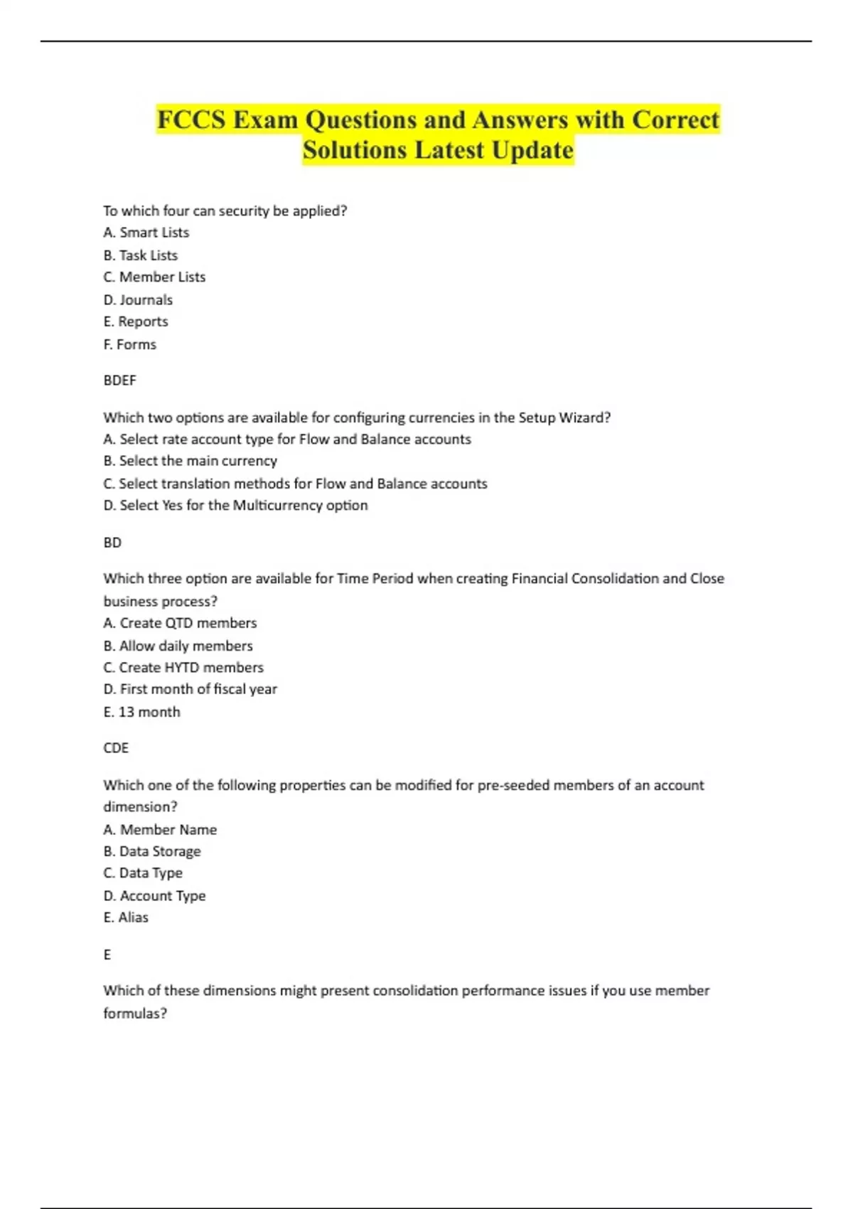 FCCS Exam Questions and Answers with Correct Solutions Latest Update To which four can security be applied? A. Smart Lists B. Task Lists C. Member Lists D. Journals E. Reports F. Forms BDEF Which two options are available for configuring currencies in the Setup Wizard? A. Select rate account type for Flow and Balance accounts B. Select the main currency C. Select translation methods for Flow and Balance accounts D. Select Yes for the Multicurrency option BD Which three option are available for Time Period when creating Financial Consolidation and Close business process? A. Create QTD members B. Allow daily members C. Create HYTD members D. First month of fiscal year E. 13 month CDE Which one of the following properties can be modified for pre-seeded members of an account dimension? A. Member Name B. Data Storage C. Data Type D. Account Type E. Alias E Which of these dimensions might present consolidation performance issues if you use member formulas?A. Period B. Movement C. Entity D. Account B Which dimension can have shared members prior to primary members? A. Intercompany B. Period C. Custom D. Movement E. Entit