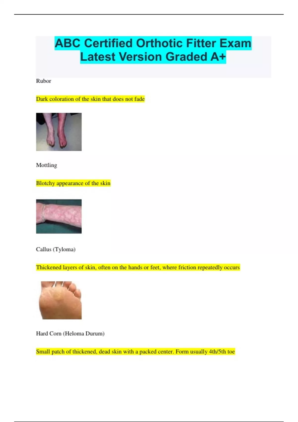 ABC Certified Orthotic Fitter Exam Latest Version Graded A+ Rubor Dark coloration of the skin that does not fade Mottling Blotchy appearance of the skin Callus (Tyloma) Thickened layers of skin, often on the hands or feet, where friction repeatedly occurs Hard Corn (Heloma Durum) Small patch of thickened, dead skin with a packed center. Form usually 4th/5th toe Soft Corn (Heloma Molle) (wound) usually in between 4th/5th wed space Edema Excess of watery fluid collecting in the cavities or tissues of the body. dependent edema a fluid accumulation in the tissues influenced by gravity; usually greater in the lower extremities than in tissue levels above the level of the heart venous edema increased capillary pressure and venous obstruction mixed edema waxy skin lymphedema swelling due to an abnormal accumulation of lymph fluid within the tissues Normal Pedal(foot) Temperature 80-90 *F Proprioception Perception or awareness of the position and movement of the body. Tuning Fork Test(weber test) Discrepancy Window 8 Seconds Stance Phase comprises what percent of the gait cycle? 62% Swing Phase comprises what percent of the gait cycle? 38% Saggital Plane divides the body into a right and left side. (Dorsiflexion/Plantarflexion) Frontal Plane Divides the body into front and back portions. (Anterior/Posterior)(inversion/Eversion) Transverse Plane horizontal division of the body into upper and lower portions (Abduction/Adduction) Pronation(of the foot) triplane movement comprised of dorsiflexion, eversion, abduction Supination(of the foot)