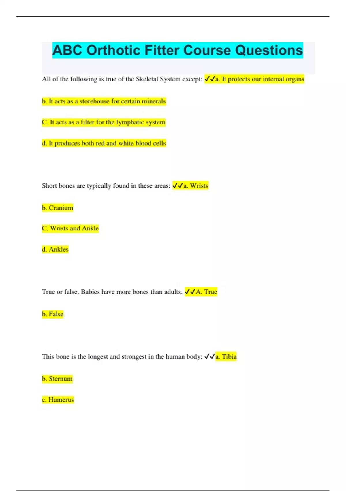 ABC Orthotic Fitter Course Questions All of the following is true of the Skeletal System except: a. It protects our internal organs b. It acts as a storehouse for certain minerals C. It acts as a filter for the lymphatic system d. It produces both red and white blood cells Short bones are typically found in these areas: a. Wrists b. Cranium C. Wrists and Ankle d. Ankles True or false. Babies have more bones than adults. A. True b. False This bone is the longest and strongest in the human body: a. Tibia b. Sternum c. Humerus D. Femur The science dealing with measurement of the size, weight, and proportions of the human body is called: A. Anthropometry b. Biomechanics c. Kinesiology d. Muscle testing These may be used to indicate anatomical landmarks on the surface of the skin: a. China markers B. Ink pencils c. Crayon d. Pencils Landmarks of the foot include all but: A. Tibial Crest b. Metatarsal Heads c. Styloid Process d. Navicular The symphysis pubis is located in the: a. Upper Extremity b. Posterior trunk C. Anterior trunk d. Lower Extremity Measurements that are done at the Natural Waist would include all but: a. Circumfrential BAngular c. M/L d. A/P Measuring from floor to knee center would be this type of measurement: a. M/L B. Length c. Circumfrential d. A/P This is a lower extremity landmark: a. Xiphoid Process B. Styloid Process c. ASIS d. Sternal Notch The Lateral malleolus is the distal end of the: a. Femur B. Fibula c. Sternum d. Tibia The Popliteal Fossa is located in the: a. Anterior Lower Extremity B. Posterior Lower Extremity c. Anterior Trunk d. Posterior Trunk The Acromion is located in the: A. Shoulder Area b. Spine c. Foot d. Lower Extremity The mandible is located in the: a. Lower Extremity b. Trunk Region C. Head