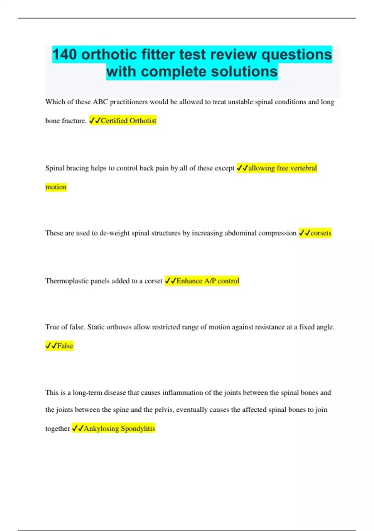 140 orthotic fitter test review questions with complete solutions Which of these ABC practitioners would be allowed to treat unstable spinal conditions and long bone fracture. Certified Orthotist Spinal bracing helps to control back pain by all of these except allowing free vertebral motion These are used to de-weight spinal structures by increasing abdominal compression corsets Thermoplastic panels added to a corset Enhance A/P control True of false. Static orthoses allow restricted range of motion against resistance at a fixed angle. False This is a long-term disease that causes inflammation of the joints between the spinal bones and the joints between the spine and the pelvis, eventually causes the affected spinal bones to join together Ankylosing Spondylitis This occurs when the bones of the spine between due to trauma. usually the trauma necessary to break the bones of the spine is quite large. in certain circumstances however, such as in elderly people and in people with cancer these same bones can break with little or no force. The vertebrae most commonly broken are those in the lower back. Vertebral compression fracture This is an inward curvature of a portion of the vertebral column.Although the human spine has some normal inward curvature, excessive inward curvature can be caused by tight low back muscles, excessive visceral fat, and pregnancy. Lordosis This condition is characterized by pain that shoots shown the leg. A bulging or ruptured (herniated) disk is the most common cause of the pain. Sciatica These orthoses usually offer additional immobilization fort he thumb area. They are indicated for soft tissue injuries, gamekeeper injuries, collateral ligament support and avulsion fractures of the thumb Thumb Spica Classic way to splint ht hand after a stroke with thumb in full opposition, wrist in dorsiflexion, and MP joints flexed. Wrist- hand Cock- up splint A shoulder orthoses provides _________ pressure on the forearm/elbow Upward This brace is effective following rotator cuff repairs, involved humeral fractures, and post op shoulder/ arm surgery where shoulder position and elbow flexion control are desired Airplane splint This upper extremity pathology is caused by an abnormal thickening of tough tissue ( fibrous layer) underneath the skin of the palm and finger that can cause the finger to curl Dupuytren Contracture This deformity of a finger is caused when the extensor tendon is damaged preventing the finger or thumb is not able to be straightened Mallet Finger This is a condition where the outer part of the elbow becomes sore and tender. Also known as lateral epicondylitis Tennis Elbow This condition is caused by compression of the median nerve at the wrist., which may result in numbness, tingling, weakness, or muscle damage in the hand and fingers. Carpel Tunnel Loss of protective sensation in the diabetic foot can be assessd via 10gram 5.07 monofilament True or false. The final fitting is not complete until the patient and/ or caregiver have successfully demonstrated donning/ doffing of the orthosis True For every business a _________ is the vital first step Business plan The orthotic fitter must use the applicable ______ codes HCPCS Selling your practice to professionals, patients
