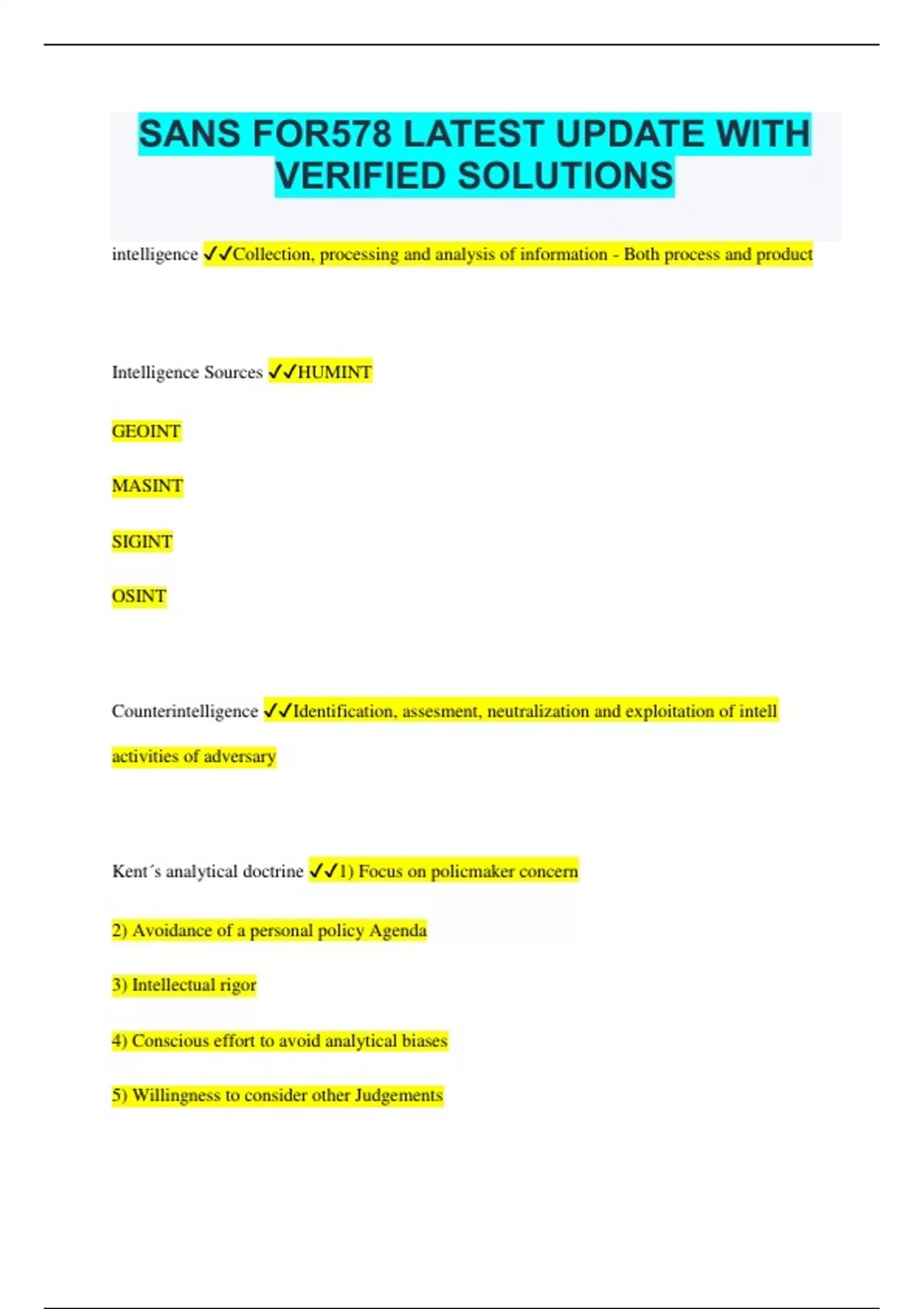 SANS FOR578 LATEST UPDATE WITH VERIFIED SOLUTIONS intelligence Collection, processing and analysis of information - Both process and product Intelligence Sources HUMINT GEOINT MASINT SIGINT OSINT Counterintelligence Identification, assesment, neutralization and exploitation of intell activities of adversary Kent ́s analytical doctrine 1) Focus on policmaker concern 2) Avoidance of a personal policy Agenda 3) Intellectual rigor 4) Conscious effort to avoid analytical biases 5) Willingness to consider other Judgements 6) Systematic use of outside expertise 7) Collective responsibility for judgement 8) Effective communication of policy-support information and judgements 9) Candid admission of mistakes Analysis A detailed examination of the elements or structure of something. Data driven analysis Drawing inferences based on examination of the intrinsic structure of data. Requires good datasets and straightforward problems. Is logically driven and easily replicated. Conceptually driven analysis Numerous unknowns and undefined variables and relationsships. Often immidiate interpretation of complex concepts. Accuracy driven by mental models and feedback over time. Working memory System that processes inputs and determines whether or not they are important, encoding them for long-term or short-term memory storage Pattern recognition Cognitive process that matches information from external sources to information that is stored in long-term memory. Template matching Every object and experience is processed by brain and stored as a template in long-term memory. When presented with situation, long-term memory is searched for matching template from the past. Prototype matching When presented with situation, long-term memory is searched for AVERAGE or similiar templates reffered as a "prototype". More flexible then template matching and better for working with incomplete information. Top Down Using previous knowledge (could be contextual) to fill in gaps when we do not have complete information. System I thinking Intiutive thinking, fast, effective, often accurate but prone to errors. Draws on available knowledge and experience and existing mental modes. System II thinking "Analyttical thinking". slow, methodical and conscious. Involves analytic processes like scientific method or structured analytical techniques. Mental Models System I thinking.