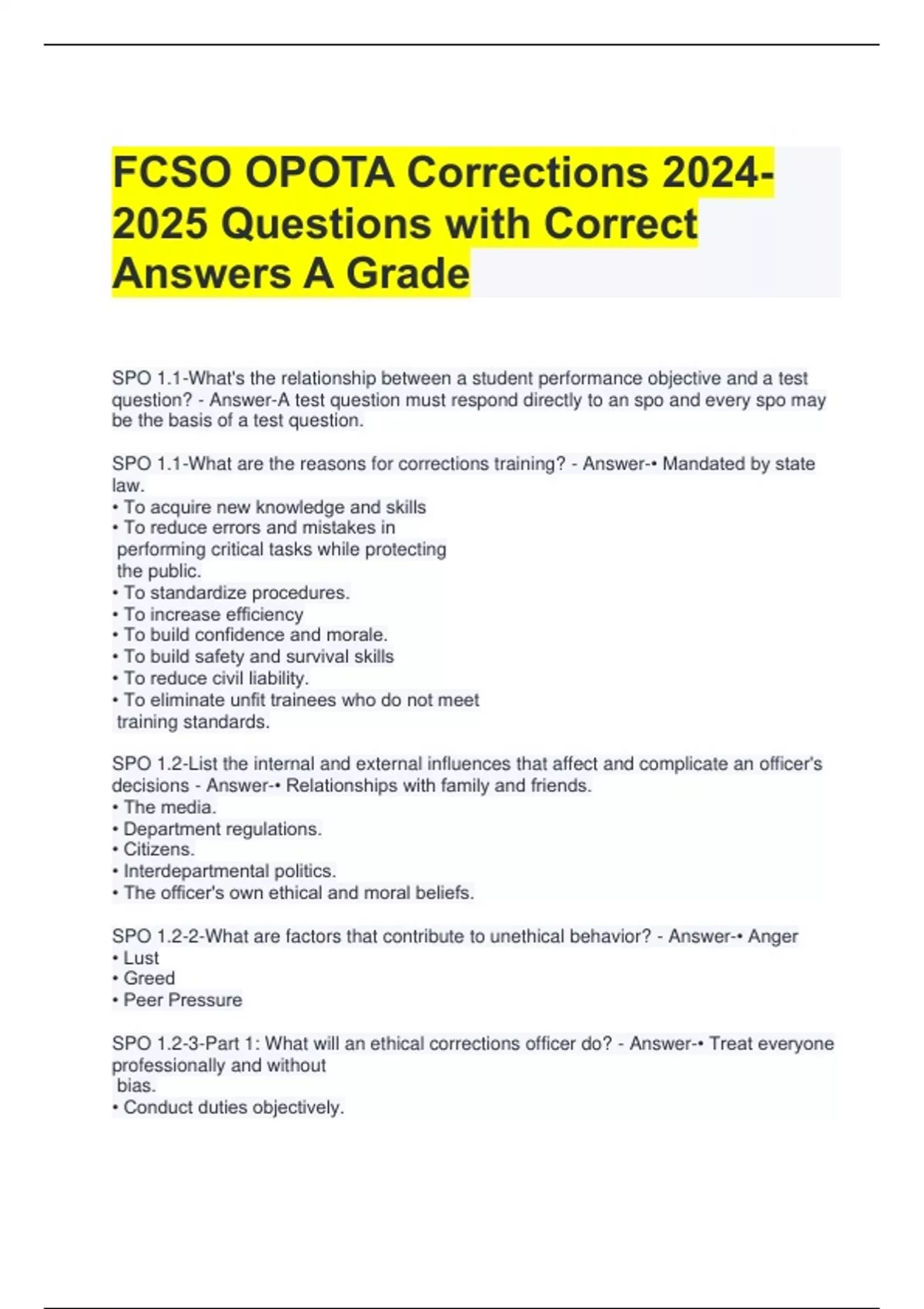 FCSO OPOTA Corrections Questions with Correct Answers A Grade SPO 1.1-What's the relationship between a student performance objective and a test question? - Answer-A test question must respond directly to an spo and every spo may be the basis of a test question. SPO 1.1-What are the reasons for corrections training? - Answer-• Mandated by state law. • To acquire new knowledge and skills • To reduce errors and mistakes in performing critical tasks while protecting the public. • To standardize procedures. • To increase efficiency • To build confidence and morale. • To build safety and survival skills • To reduce civil liability. • To eliminate unfit trainees who do not meet training standards. SPO 1.2-List the internal and external influences that affect and complicate an officer's decisions - Answer-• Relationships with family and friends. • The media. • Department regulations. • Citizens. • Interdepartmental politics. • The officer's own ethical and moral beliefs. SPO 1.2-2-What are factors that contribute to unethical behavior? - Answer-• Anger • Lust • Greed • Peer Pressure