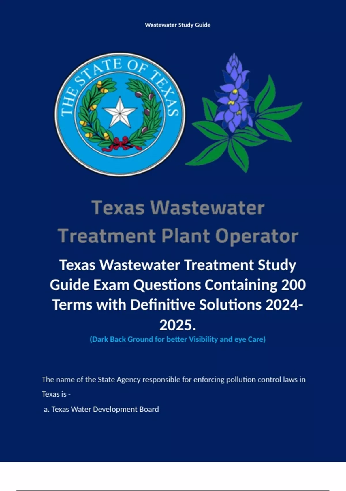 Texas Wastewater Treatment Study Guide Exam Questions Containing 200 Terms with Definitive Solutions .