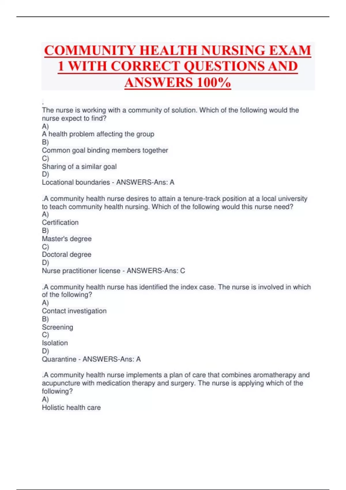 The nurse is working with a community of solution. Which of the following would the nurse expect to find? A) A health problem affecting the group B) Common goal binding members together C) Sharing of a similar goal D) Locational boundaries - ANSWERS-Ans: A .A community health nurse desires to attain a tenure-track position at a local university to teach community health nursing. Which of the following would this nurse need? A) Certification B) Master's degree C) Doctoral degree D) Nurse practitioner license - ANSWERS-Ans: C .A community health nurse has identified the index case. The nurse is involved in which of the following? A) Contact investigation B) Screening C) Isolation D) Quarantine - ANSWERS-Ans: A .A community health nurse implements a plan of care that combines aromatherapy and acupuncture with medication therapy and surgery. The nurse is applying which of the following? A) Holistic health care B) Folk medicine care C) Herbalistic health care D) Integrated health care - ANSWERS-Ans: D .A community health nurse is assessing a family during a home visit. The nurse is examining the mother who is pregnant with her second child. The nurse asks the mother to raise her arms above her head. The mother replies, "I can't do this because it will cause the umbilical cord to strangle the baby." The nurse interprets this statement as reflective of which of the following? A) Home remedy B) Herbalism C) Folk medicine D) Alternative therapy - ANSWERS-Ans: C .A community health nurse is developing health promotion programs for a local community that consists predominantly of African Americans. Which of the following areas would be a priority for health promotion with this group? A) Cardiac health B) Respiratory care C) Mental health D) Skin care - ANSWERS-Ans: A .A community health nurse is explaining the chain of causation to a family that includes a child who has developed Lyme disease. The nurse correctly describes the opening in the child's skin caused by the actual tick bite as the A) reservoir. B) mode of transmission. C) portal of entry. D) host. - ANSWERS-Ans: C .A community health nurse is integrating the epidemiology of wellness into practice. Which of the following would the nurse include? A) Lifestyle with its self-created risks B) Communicable disease control C) The natural history of disease D) Vital statistics and reportable diseases - ANSWERS-Ans: A .A community health nurse is involved in a project to evaluate the health of a city. Which of the following findings would suggest that the city would most likely need additional programs? A) Citizens are actively involved in the city's department of recreation and after-school programs. B) The construction of affordable organized housing developments and communities is nearing completion. C) Approximately one third of the people are recently unemployed due to closure of the automotive factory. D) Several new recreational facilities for adults and children have been created at several locations. - ANSWERS-Ans: C .A community health nurse is participating in a case-control observational study. Which of the following would most likely explain this type of study? A) Description of patterns of occurrence of illness and injury in a population B) Investigation of development of health-illness conditions over a long period of time C) Studying of a cohort with evaluation of variables associated with the disease or injury D) Comparison of persons with and without a health-illness condition - ANSWERS-Ans: D .A community health nurse is preparing a presentation for a group of nursing students about community health nursing. Which of the following descriptions about community health nursing would the nurse most likely include in the presentation? A) Focusing on addressing continuous needs B) Working with the client as an equal partner C) Engaging in tertiary prevention as the priority D) Encouraging clients to reach out to the nurse - ANSWERS-Ans: B .A community health nurse is preparing to carry out an experimental epidemiologic study. Which of the following would be most important for the nurse to do? A) Focus the study on evaluating the cause of a disease B) Ensure carefully controlled conditions during the study C) Expose both groups to the same factor or condition D) Ensure that there are a substantial number of subjects - ANSWERS-Ans: B .A community health nurse is presenting a program about hepatitis prevention and risk reduction to a local community group. The nurse determines that the group has understood the program when they identify which method as the major mode of transmission for hepatitis B? A) Oral-fecal route B) Exposure to contaminated blood C) Airborne droplet nuclei D) Infected rodents, such as mice and rats - ANSWERS-Ans: B .A community health nurse is providing care to a family in the community who are Muslim. Which of the following would be most important for the nurse to integrate when providing care for this family? A) Rules are stricter for boys than for girls. B) Modest dressing is key for both men and women. C) Most Arabic women work outside the home. D) Most adhere to the three tenets of Islam. - ANSWERS-Ans: B .A community health nurse is providing care to an Asian American family who believes that a member's current illness is due to an excess of yin. The nurse integrates knowledge of this belief, expecting the family to avoid which foods? A) Rice B) Eggs C) Chicken D) Fruits - ANSWERS-Ans: D .A community health nurse is providing care to several cultural groups in the community. When providing transcultural nursing, which of the following would be the priority? A) Examining one's own culture carefully and recognizing that alternative viewpoints are possible B) Recognizing that cultural values, beliefs, and practices influence people's health and lifestyles C) Obtaining health-related information about a cultural group concerning their values, beliefs, and practices D) Actively and attentively listening to demons