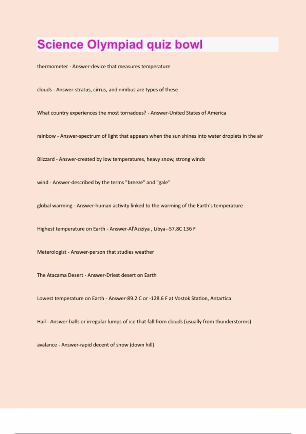 clouds - Answer-stratus, cirrus, and nimbus are types of these What country experiences the most tornadoes? - Answer-United States of America rainbow - Answer-spectrum of light that appears when the sun shines into water droplets in the air Blizzard - Answer-created by low temperatures, heavy snow, strong winds wind - Answer-described by the terms "breeze" and "gale" global warming - Answer-human activity linked to the warming of the Earth's temperature Highest temperature on Earth - Answer-Al'Aziziya , Libya--57.8C 136 F Meterologist - Answer-person that studies weather The Atacama Desert - Answer-Driest desert on Earth Lowest temperature on Earth - Answer-89.2 C or -128.6 F at Vostok Station, Antartica Hail - Answer-balls or irregular lumps of ice that fall from clouds (usually from thunderstorms) avalance - Answer-rapid decent of snow (down hill)most rainfall on Earth - Answer-25.4 meters of rain in Cherrapunji, India Barometer - Answer-instrument used to measure atmospheric pressure anemometer - Answer-instrument to measure wind speed