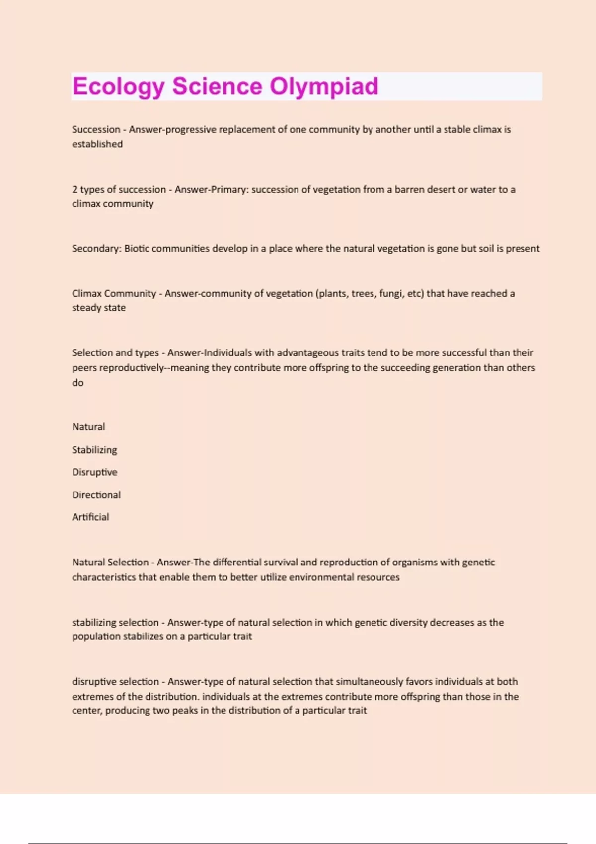 Succession - Answer-progressive replacement of one community by another until a stable climax is established 2 types of succession - Answer-Primary: succession of vegetation from a barren desert or water to a climax community Secondary: Biotic communities develop in a place where the natural vegetation is gone but soil is present Climax Community - Answer-community of vegetation (plants, trees, fungi, etc) that have reached a steady state Selection and types - Answer-Individuals with advantageous traits tend to be more successful than their peers reproductively--meaning they contribute more offspring to the succeeding generation than others do Natural Stabilizing Disruptive Directional Artificial Natural Selection - Answer-The differential survival and reproduction of organisms with genetic characteristics that enable them to better utilize environmental resources stabilizing selection - Answer-type of natural selection in which genetic diversity decreases as the population stabilizes on a particular trait disruptive selection - Answer-type of natural selection that simultaneously favors individuals at both extremes of the distribution. individuals at the extremes contribute more offspring than those in the center, producing two peaks in the distribution of a particular traitdirectional selection - Answer-when natural selection favors a single allele and therefore allele frequency continuously shift in one direction artificial selection - Answer-The process in which breeders choose the variants to be used to produce succeeding generations limiting factors - Answer-A factor that limits a population's growth; i.e. resources, shelter, food and disease biodiversity - Answer-number and diversity of organisms in a biome/region Acid precipitation - Answer-Includes acid rain, acid fog, acid snow, and any other form of precipitation that is more acidic that normal (i.e., less that pH 5.6). Amensalism - Answer-Two organisms in a symbiotic relationship in which one is unaffected and one is harmed (the black walnut tree secretes juglone which kills the plants living at base of tree, but the lack of competition doesn't help or harm the tree). This is a very rare type of symbiosis. Ammonification - Answer-The process by which decomposers change nitrogen in detritus to ammonium (NH4+) Anaerobic, adj. - Answer-Lacking or seriously depleted of oxygen Assimilation - Answer-The process by which plants absorb nitrate or ammonium through root hairs to be used within the plant Batesian Mimicry - Answer-Resemblance of an unpalatable species by an edible species to deceive predators Biodiversity - Answer-Variety of different species (species diversity), genetic variability among individuals within a species (genetic diversity), variety of ecosystems (ecological diversity), and functions such as energy flow and matter cycling needed for the survival of a species and biological communitiesBiotic - Answer-Living or once living organisms.(Bunny, Dead Bunny) Biotic potential - Answer-Maximum rate at which the population of a given species can increase when there are no limits on its rate of growth Carbon Cycle - Answer-Cyclic movement of carbon in different chemical forms from the environment to organisms then back to the environment Carrying Capacity - Answer-The maximum number of organisms that an environment can support Chemosynthesis - Answer-Process in which certain organisms (mostly specialized bacteria) extract inorganic compounds from their environment and convert them into organic nutrient compounds without the presence of sunlight