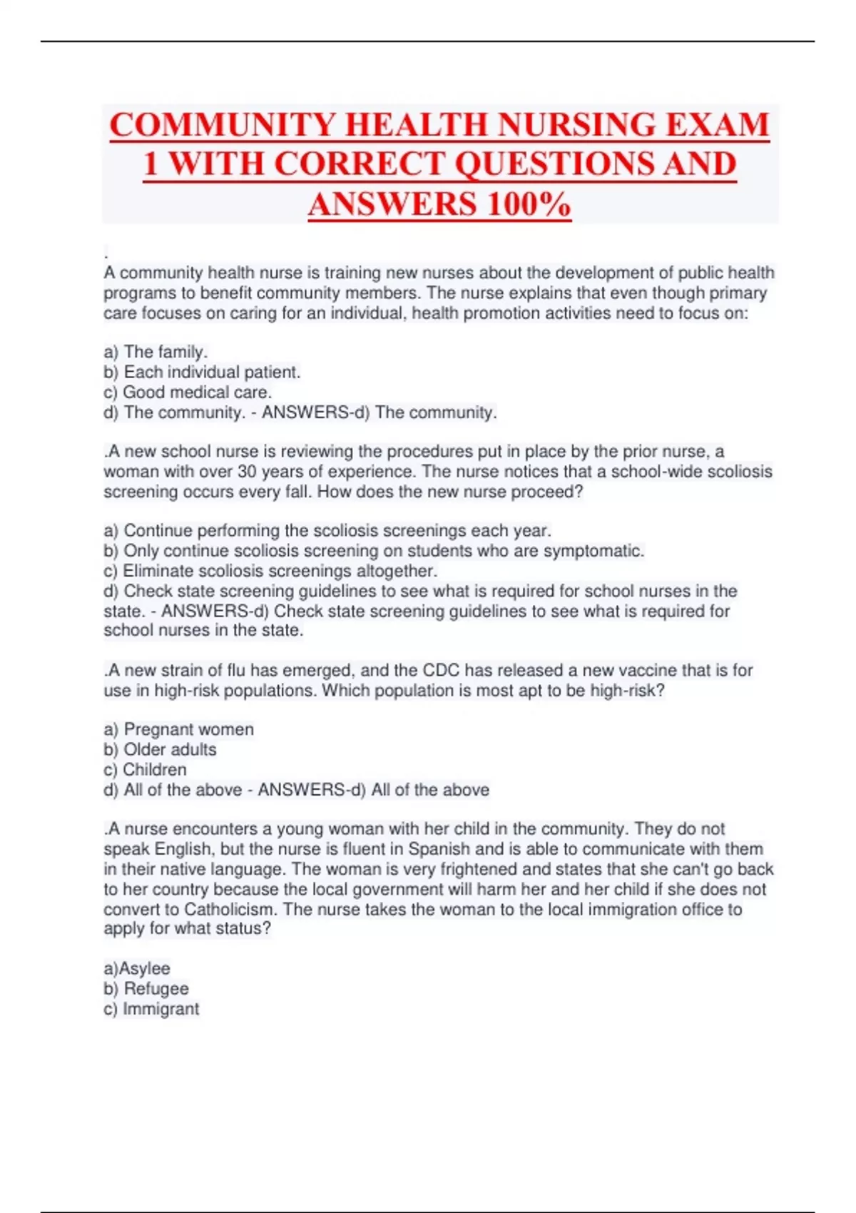 A community health nurse is training new nurses about the development of public health programs to benefit community members. The nurse explains that even though primary care focuses on caring for an individual, health promotion activities need to focus on: a) The family. b) Each individual patient. c) Good medical care. d) The community. - ANSWERS-d) The community. .A new school nurse is reviewing the procedures put in place by the prior nurse, a woman with over 30 years of experience. The nurse notices that a school-wide scoliosis screening occurs every fall. How does the new nurse proceed? a) Continue performing the scoliosis screenings each year. b) Only continue scoliosis screening on students who are symptomatic. c) Eliminate scoliosis screenings altogether. d) Check state screening guidelines to see what is required for school nurses in the state. - ANSWERS-d) Check state screening guidelines to see what is required for school nurses in the state. .A new strain of flu has emerged, and the CDC has released a new vaccine that is for use in high-risk populations. Which population is most apt to be high-risk? a) Pregnant women b) Older adults c) Children d) All of the above - ANSWERS-d) All of the above .A nurse encounters a young woman with her child in the community. They do not speak English, but the nurse is fluent in Spanish and is able to communicate with them in their native language. The woman is very frightened and states that she can't go back to her country because the local government will harm her and her child if she does not convert to Catholicism. The nurse takes the woman to the local immigration office to apply for what status? a)Asylee b) Refugee c) Immigrant d) Permanent resident - ANSWERS-a)Asylee .A nurse has been contacted to consult with the coordinating health organization of the U.N. This means that the nurse will be working with: a) WHO b) Global Health Center c) World Bank d) CDC - ANSWERS-a) WHO .A nurse has observed that a particular fifth grade student visits the office two to three times each week with stomach aches, headaches, and vague complaints of not feeling well. This has been continuing for several months. What is the most appropriate action for the nurse to take? a) Refuse to see the child anymore. b) Call his parents to discuss his symptoms and the need to be evaluated by his pediatrician. c) Send the child home until he obtains medical clearance to return. d) Refer him to the school psychiatrist for mental evaluation. - ANSWERS-b) Call his parents to discuss his symptoms and the need to be evaluated by his pediatrician. .A nurse has worked at a community health center for many years. Over the last several months, the nurse has noticed a significant decline in community members using the resources available at the clinic. What is the first thing the nurse should do? a) Begin offering daycare services and free transportation to the clinic to make it more convenient. b) Reach out to former patients to determine why they are no longer returning to the clinic. c) Perform a community assessment. d) Begin offering a new patient reduced fee rate. - ANSWERS-b) Reach out to former patients to determine why they are no longer returning to the clinic. .A nurse is assisting a primary health clinic in a rural South American country in establishing a quality and inclusive primary care program. The nurse reviews the WHO components of primary health care for guidance. Which of the following components are included in the WHO guide? a) Diminish social disparities in health. b) Improve maternal and child health care. c) Better organize health care around the needs of the community. d) Improve funding for primary-care programs. e) Increase collaborative relationships and stakeholder participation in public policy development. - ANSWERS-a) Diminish social disparities in health. c) Better organize health care around the needs of the community. e) Increase collaborative relationships and stakeholder participation in public policy development. .A nurse is caring for a young homeless man on the medical floor of the local hospital. He was admitted several days ago to safely detox from alcohol. He reports having nowhere to go once he is discharged. Who should be involved in his discharge planning? a) Social worker b) Addiction specialist c) Psychiatrist d) All of the above - ANSWERS-d) All of the above .A nurse is caring for a young man in the emergency department. He presents with severe headache, a rash, joint pain, and a fever of 10c.5° F. He reports having traveled to India recently. What does the nurse suspect? a) Leishmaniasis b) Dengue fever c) Severe acute respiratory syndrome d) Malaria - ANSWERS-b) Dengue fever .A nurse is caring for a young man who is squatting in an old factory a mile away. The nurse documents that he is experiencing what type of homelessness? a) Primary b) Secondary c) Tertiary d) He is not homeless because he has an indoor shelter in which to sleep. - ANSWERS-a) Primary .A nurse is counseling a young woman with a new diagnosis of gonorrhea. What should be included in her care? a) The nurse will need to contact all of the woman's prior sexual partners to inform them of her diagnosis. b) Since filing a partner management report with the state health department is mandated, the nurse should inform the patient that she will be sending a report. c) All of the above d) None of the above - ANSWERS-b) Since filing a partner management report with the state health department is mandated, the nurse should inform the patient that she will be sending a report. .A nurse is educating emergency department nurses about the symptoms of Avian influenza, as there is some evidence of infection overseas. The nurse wants the staff to be aware of the symptoms so they can closely monitor for the virus. Which of the following symptoms should be included? a) Eye infections b) Pneumonia c) Fever d) Muscle weakness and paralysis e) Cough - ANSWERS-a) Eye infections 