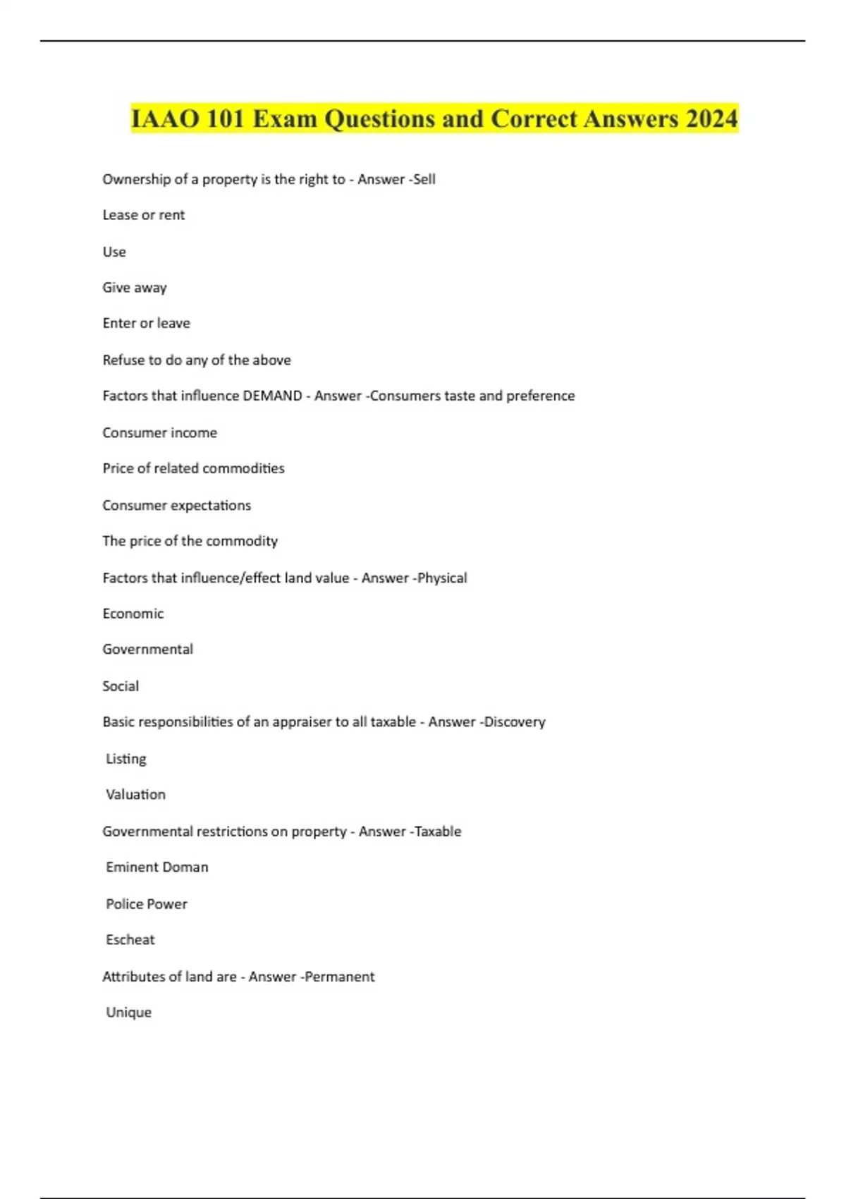 IAAO 101 Exam Questions and Correct Answers 2024 Ownership of a property is the right to - Answer -Sell Lease or rent Use Give away Enter or leave Refuse to do any of the above Factors that influence DEMAND - Answer -Consumers taste and preference Consumer income Price of related commodities Consumer expectations The price of the commodity Factors that influence/effect land value - Answer -Physical Economic Governmental Social Basic responsibilities of an appraiser to all taxable - Answer -Discovery Listing Valuation Governmental restrictions on property - Answer -Taxable Eminent Doman Police Power