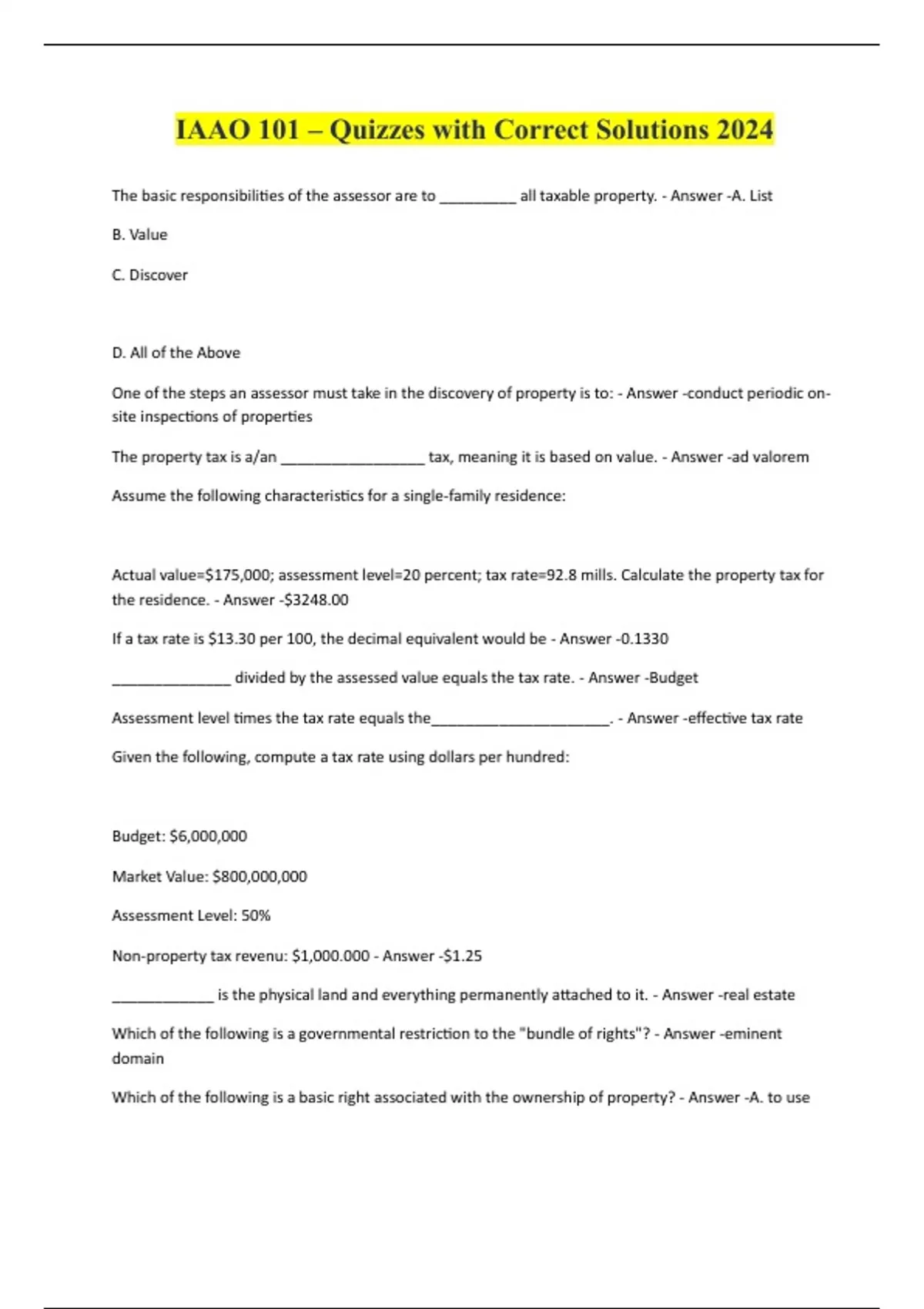 IAAO 101 – Quizzes with Correct Solutions 2024 The basic responsibilities of the assessor are to _________ all taxable property. - Answer -A. List B. Value C. Discover D. All of the Above One of the steps an assessor must take in the discovery of property is to: - Answer -conduct periodic onsite inspections of properties The property tax is a/an _________________ tax, meaning it is based on value. - Answer -ad valorem Assume the following characteristics for a single-family residence: Actual value=$175,000; assessment level=20 percent; tax rate=92.8 mills. Calculate the property tax for the residence. - Answer -$3248.00 If a tax rate is $13.30 per 100, the decimal equivalent would be - Answer -0.1330 ______________ divided by the assessed value equals the tax rate. - Answer -Budget Assessment level times the tax rate equals the_____________________. - Answer -effective tax rate Given the following, compute a tax rate using dollars per hundred: Budget: $6,000,000 Market Value: $800,000,000 Assessment Level: 50% Non-property tax revenu: $1,000.000 - Answer -$1.25 ____________ is the physical land and everything permanently attached to it. - Answer -real estate Which of the following is a governmental restriction to the "bundle of