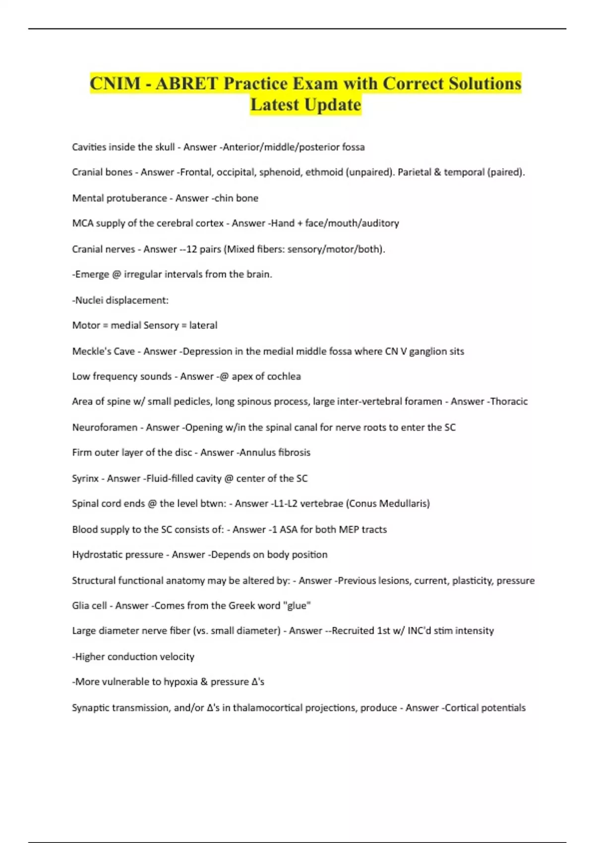 CNIM - ABRET Practice Exam with Correct Solutions Latest Update Cavities inside the skull - Answer -Anterior/middle/posterior fossa Cranial bones - Answer -Frontal, occipital, sphenoid, ethmoid (unpaired). Parietal & temporal (paired). Mental protuberance - Answer -chin bone MCA supply of the cerebral cortex - Answer -Hand + face/mouth/auditory Cranial nerves - Answer --12 pairs (Mixed fibers: sensory/motor/both). -Emerge @ irregular intervals from the brain. -Nuclei displacement: Motor = medial Sensory = lateral Meckle's Cave - Answer -Depression in the medial middle fossa where CN V ganglion sits Low frequency sounds - Answer -@ apex of cochlea Area of spine w/ small pedicles, long spinous process, large inter-vertebral foramen - Answer -Thoracic Neuroforamen - Answer -Opening w/in the spinal canal for nerve roots to enter the SC Firm outer layer of the disc - Answer -Annulus fibrosis Syrinx - Answer -Fluid-filled cavity @ center of the SC Spinal cord ends @ the level btwn: - Answer -L1-L2 vertebrae (Conus Medullaris) Blood supply to the SC consists of: - Answer -1 ASA for both MEP tracts Hydrostatic pressure - Answer -Depends on body position Structural functional anatomy may be altered by: - Answer -Previous lesions, current, plasticity, pressure Glia cell - Answer -Comes from the Greek word "glue" Large diameter nerve fiber (vs. small diameter) - Answer --Recruited 1st w/ INC'd stim intensity -Higher conduction velocity -More vulnerable to hypoxia & pressure Δ's Synaptic transmission, and/or Δ's in thalamocortical projections, produce - Answer -Cortical potentialsPeripheral nerve sensitivity - Answer -Least sensitive to injury (more sensitive = SC grey/white mater, cortical grey matter) Cavernous angiomas - Answer -Multi-lobulated lesions containing hemorrhage Geriatric population: prevalence of temporal bone hyperostosis - Answer -10-15% Presbycusis - Answer -High freq hearing loss; gradually occurs in older individuals Most commonly injured CN - Answer -Facial nerve (VII) Burst fracture - Answer --Break in the vertebra -Failure of anterior & middle vertebral columns -Caused by violent compressive event (fall, MVA) Excessive neck flexion in sitting position - Answer -Quadraparesis (due to ischemia in upper T-spine) Lhermittes Sign - Answer -Shocking sensation that occurs throughout the body during neck flexion Central Cord Syndrome (CCS) - Answer --Sacral sparing -Loss of sensory/motor fx @ level of injury -Disruption of grey matter (+) Babinski Sign could indicate - Answer --severe [UMN] SC traum