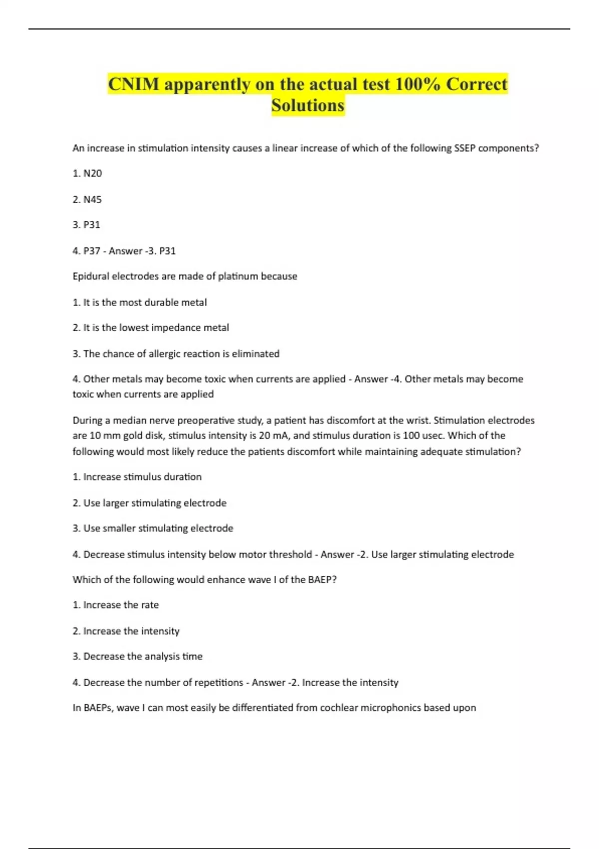 CNIM apparently on the actual test 100% Correct Solutions An increase in stimulation intensity causes a linear increase of which of the following SSEP components? 1. N20 2. N45 3. P31 4. P37 - Answer -3. P31 Epidural electrodes are made of platinum because 1. It is the most durable metal 2. It is the lowest impedance metal 3. The chance of allergic reaction is eliminated 4. Other metals may become toxic when currents are applied - Answer -4. Other metals may become toxic when currents are applied During a median nerve preoperative study, a patient has discomfort at the wrist. Stimulation electrodes are 10 mm gold disk, stimulus intensity is 20 mA, and stimulus duration is 100 usec. Which of the following would most likely reduce the patients discomfort while maintaining adequate stimulation? 1. Increase stimulus duration 2. Use larger stimulating electrode 3. Use smaller stimulating electrode 4. Decrease stimulus intensity below motor threshold - Answer -2. Use larger stimulating electrode Which of the following would enhance wave I of the BAEP? 1. Increase the rate 2. Increase the intensity 3. Decrease the analysis time 4. Decrease the number of repetitions - Answer -2. Increase the intensity In BAEPs, wave I can most easily be differentiated from cochlear microphonics based upon1. Amplitude 2. Morphology 3. Click polarity 4. Absence in contralateral recording - Answer -3. Click polarity What is the interstimulus interval of a 50 Hz click stimulus? 1. 0.02 msec 2. 0.20 msec 3. 0.50 msec 4. 20.00 msec - Answer -4. 20.00 msec Contralateral masking should be used during BAEPs to 1. Help the patient relax 2. Enhance wave I amplitude 3. Separate the IV/V complex 4. Prevent crossover responses - Answer -4. Prevent crossover responses The complete absence of a BAEP is most likely the result of 1. Sedation 2. Multip