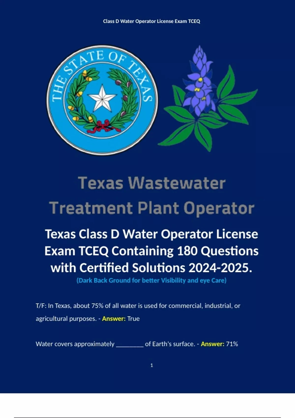Texas Class D Water Operator License Exam TCEQ Containing 180 Questions with Certified Solutions .