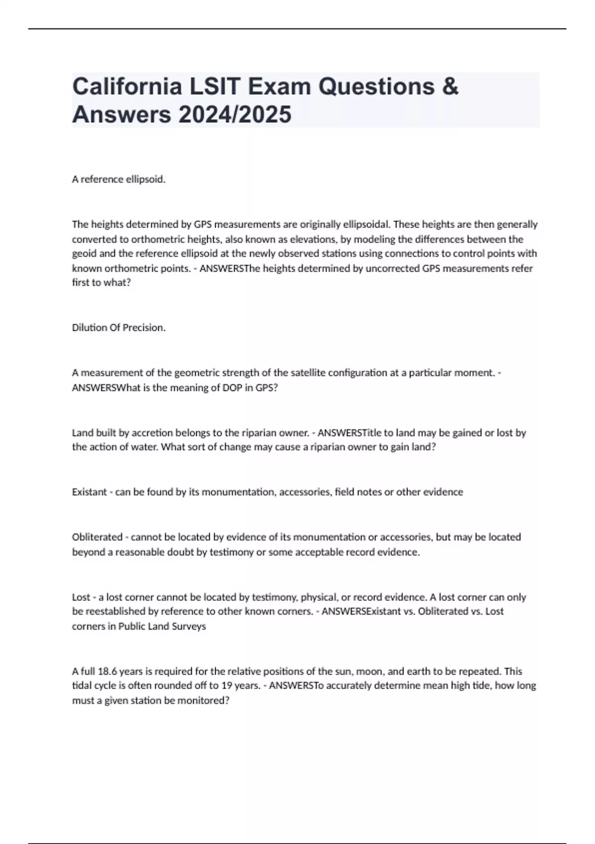 California LSIT Exam Questions & Answers 2024/2025 A reference ellipsoid. The heights determined by GPS measurements are originally ellipsoidal. These heights are then generally converted to orthometric heights, also known as elevations, by modeling the differences between the geoid and the reference ellipsoid at the newly observed stations using connections to control points with known orthometric points. - ANSWERSThe heights determined by uncorrected GPS measurements refer first to what? Dilution Of Precision. A measurement of the geometric strength of the satellite configuration at a particular moment. - ANSWERSWhat is the meaning of DOP in GPS? Land built by accretion belongs to the riparian owner. - ANSWERSTitle to land may be gained or lost by the action of water. What sort of change may cause a riparian owner to gain land? Existant - can be found by its monumentation, accessories, field notes or other evidence Obliterated - cannot be located by evidence of its monumentation or accessories, but may be located beyond a reasonable doubt by testimony or some acceptable record evidence. Lost - a lost corner cannot be located by testimony, physical, or record evidence. A lost corner can only be reestablished by reference to other known corners. - ANSWERSExistant vs. Obliterated vs. Lost corners in Public Land Surveys A full 18.6 years is required for the relative positions of the sun, moon, and earth to be repeated. This tidal cycle is often rounded off to 19 years. - ANSWERSTo accurately determine mean high tide, how long must a given station be monitored?