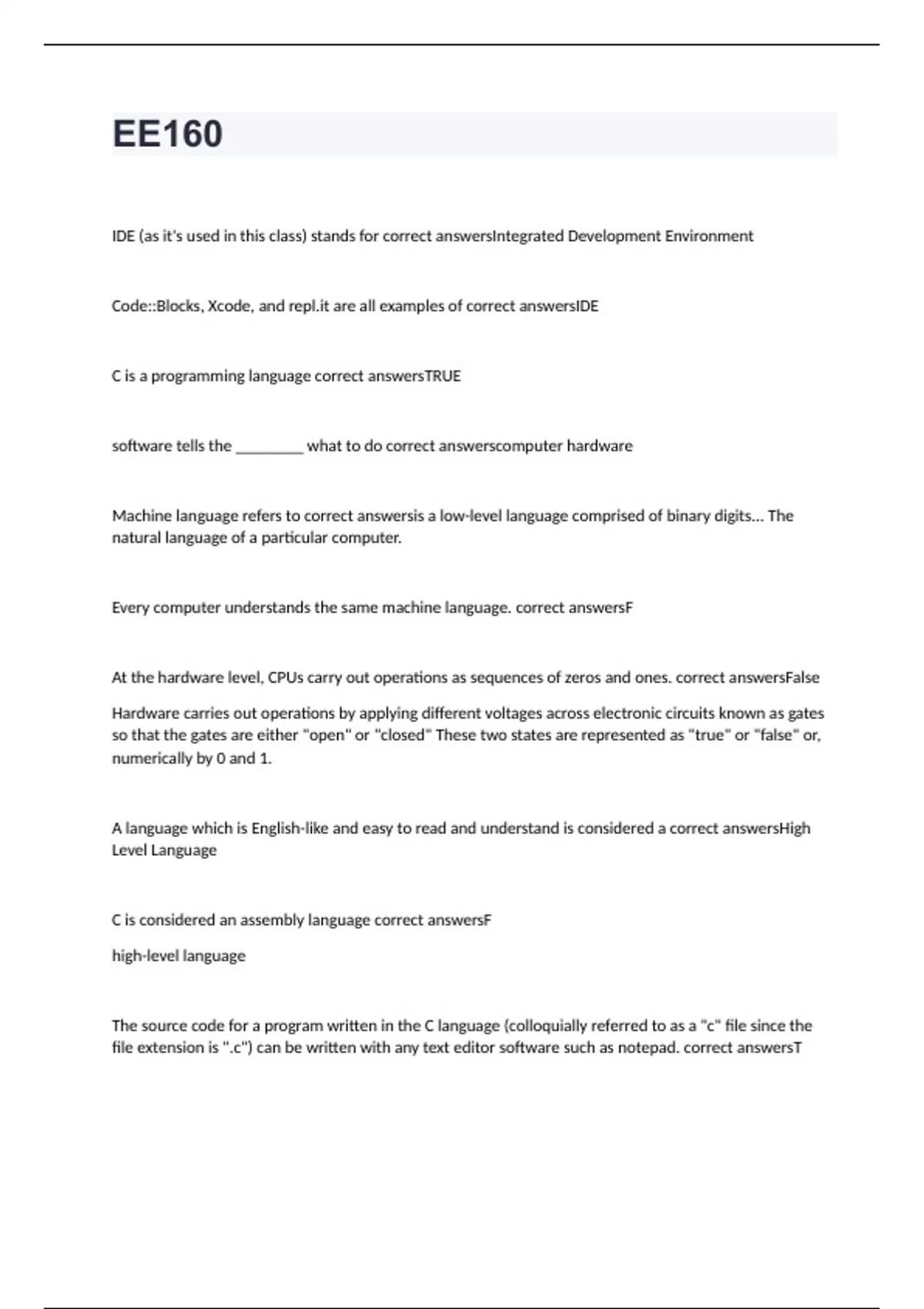 IDE (as it's used in this class) stands for correct answersIntegrated Development Environment Code::Blocks, Xcode, and are all examples of correct answersIDE C is a programming language correct answersTRUE software tells the ________ what to do correct answerscomputer hardware Machine language refers to correct answersis a low-level language comprised of binary digits... The natural language of a particular computer. Every computer understands the same machine language. correct answersF At the hardware level, CPUs carry out operations as sequences of zeros and ones. correct answersFalse Hardware carries out operations by applying different voltages across electronic circuits known as gates so that the gates are either "open" or "closed" These two states are represented as "true" or "false" or, numerically by 0 and 1. A language which is English-like and easy to read and understand is considered a correct answersHigh Level Language C is considered an assembly language correct answersF high-level language The source code for a program written in the C language (colloquially referred to as a "c" file since the file extension is ".c") can be written with any text editor software such as notepad. correct answersT
