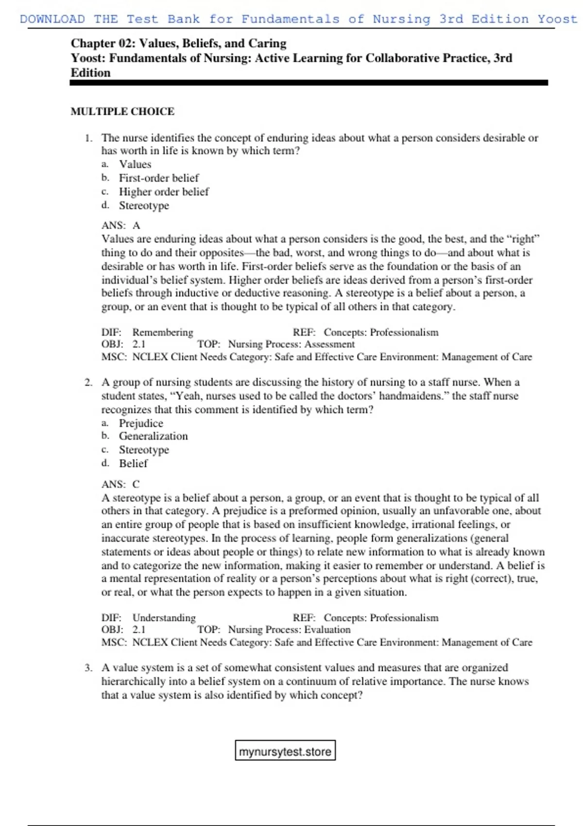 1. The nurse identifies the concept of enduring ideas about what a person considers desirable or has worth in life is known by which term? a. Values b. First-order belief c. Higher order belief d. Stereotype ANS: A Values are enduring ideas about what a person considers is the good, the best, and the “right” thing to do and their opposites—the bad, worst, and wrong things to do—and about what is desirable or has worth in life. First-order beliefs serve as the foundation or the basis of an individual’s belief system. Higher order beliefs are ideas derived from a person’s first-order beliefs through inductive or deductive reasoning. A stereotype is a belief about a person, a group, or an event that is thought to be typical of all others in that category. DIF: Remembering REF: Concepts: Professionalism OBJ: 2.1 TOP: Nursing Process: Assessment MSC: NCLEX Client Needs Category: Safe and Effective Care Environment: Management of Care 2. A group of nursing students are discussing the history of nursing to a staff nurse. When a student states, “Yeah, nurses used to be called the doctors’ handmaidens.” the staff nurse recognizes that this comment is identified by which term? a. Prejudice b. Generalization c. Stereotype d. Belief ANS: C A stereotype is a belief about a person, a group, or an event that is thought to be typical of all others in that category. A prejudice is a preformed opinion, usually an unfavorable one, about an entire group of people that is based on insufficient knowledge, irrational feelings, or inaccurate stereotypes. In the process of learning, people form generalizations (general statements or ideas about people or things) to relate new information to what is already known and to categorize the new information, making it easier to remember or understand. A belief is a mental representation of reality or a person’s perceptions about what is right (correct), true, or real, or what the person expects to happen in a given situation. DIF: Understanding REF: Concepts: Professionalism OBJ: 2.1 TOP: Nursing Process: Evaluation MSC: NCLEX Client Needs Category: Safe and Effective Care Environment: Management of Care 3. A value system is a set of somewhat consistent values and measures that are organized hierarchically into a belief system on a continuum of relative importance. The nurse knows that a value system is also identified by which concept? DOWNLOAD THE Test Bank for Fundamentals of Nursing 3rd Edition Yoost a. It is culturally based. b. It is unique to each individual. c. It is a poor basis for making decisions. d. It is rigid and uniform within a culture. ANS: A Anthropologists and social scientists have noted that in every culture, a particular value system prevails and consists of culturally defined moral and ethical principles and rules that are learned in childhood. Everyone possesses a relatively small number of values and may share the same values with others, but to different degrees. A value system helps the person choose between alternatives, resolve values conflicts, and make decisions. Within every culture, however, values vary widely among subcultural groups and even between individuals on the basis of the person’s gender, personal experiences, personality, education, and many other variables. DIF: Remembering REF: Concepts: Professionalism OBJ: 2.1 TOP: Nursing Process: Assessment MSC: NCLEX Client Needs Category: Psychosocial Integrity 4. The nurse is caring for a patient who is under arrest for murder and is attempting to perform nursing care duties while, at the same time, feeling a sense of repugnance toward the patient. The nurse recognizes this situation is identified by which term? a. Values clarification b. Values conflict c. First-order beliefs d. Higher order beliefs ANS: B A values conflict occ
