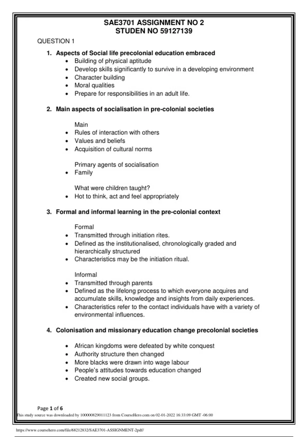 QUESTION 2 1. What was taught in schools in the 19th century Work discipline Christian doctrine Catechists and teaches how to organise their services. How to spread their Gospel Manual work and practical training. 2. Validity of criticisms Racism and subordination – mission schools were segregated on lines of colour. White Black people were doing things separately. Industrial and manual education – the missionaries belief in the value of hard work. Industrial training that was included in the curriculum was not of high enough standard to prepare people to take up skilled jobs in different sorts of economy. Critics say that separation, Christian values, humanity, pity, discipline and different levels of school helped to prepare black people to accept a subordinate position in the society. Sexism and woman’s subordination – brought together the place of woman in society. Critics’ belief that woman was only trained for domesticity and they were not part of the economy as they had the right to be. Higher levels of education were aimed at men not women. 3. The type of education the National Party introduced through the Bantu Education Act of 1953 The NP wanted to create the minimal conditions of social reproduction within the urban areas. Therefore, the NP permitted major expansion in urban housing and Education. Bantu Education policy stabilised the educational system. The policy attempted to establish a new hegemony to assist forces to work for the government. They created new sources of resentment in the education system. Government insisted on primary education Taught a policy of job reservation to generate shortage of skilled labour. Created mass education that turned students in to powerful social forces with a common identity. This study source was downloaded by from CourseH on :33:09 GMT -06:00 SAE3701 ASSIGNMENT NO 2 STUDEN NO Page 3 of 6 4. Major criticisms of Bantu Education Poor teaching training Double sessions for teachers Overcrowded classrooms Education was built on a shallow foundation Provision of adequate finance for black education. This study source was downloaded by from CourseH on :33:09 GMT -06:00 SAE3701 ASSIGNMENT NO 2 STUDEN NO Page 4 of 6 QUESTION 3 1. Who initiated the 1976 Student Revolt and why? It was initiated by SOW