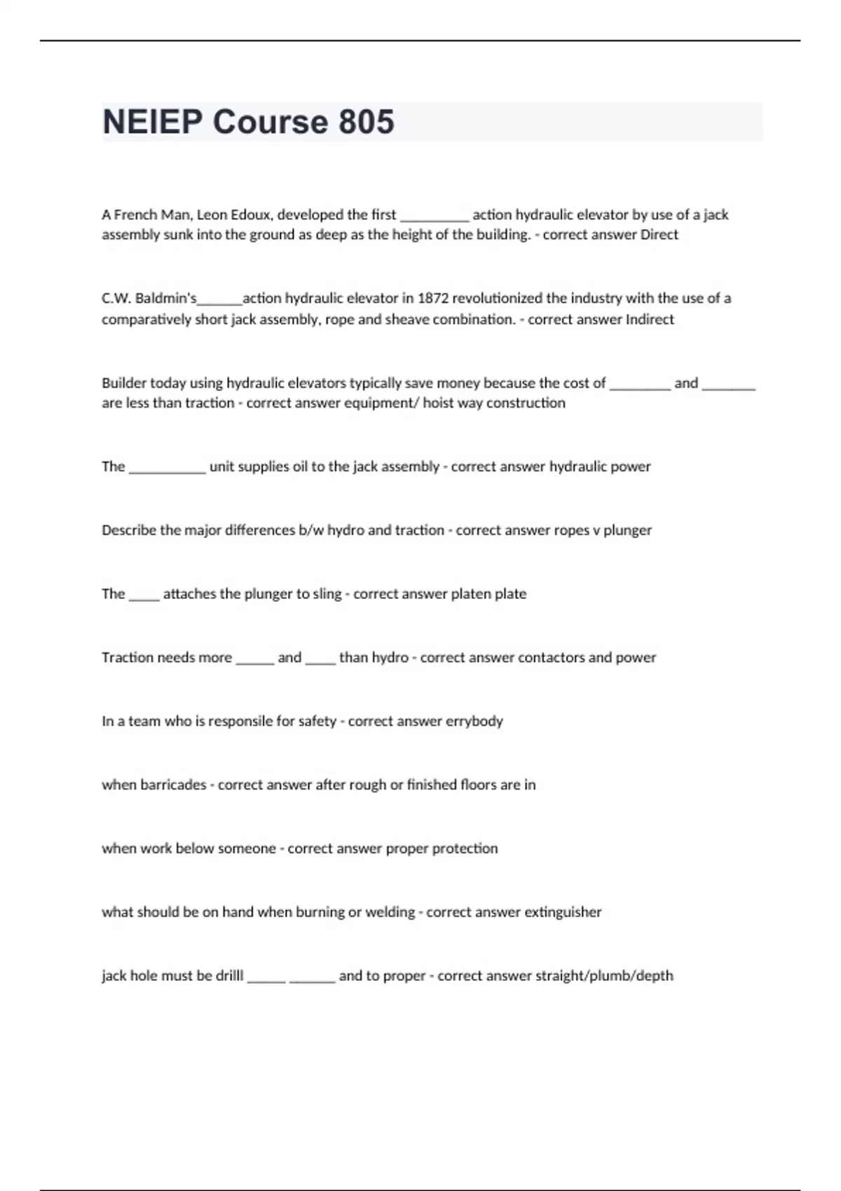 NEIEP Course 805 A French Man, Leon Edoux, developed the first _________ action hydraulic elevator by use of a jack assembly sunk into the ground as deep as the height of the building. - correct answer Direct C.W. Baldmin's______action hydraulic elevator in 1872 revolutionized the industry with the use of a comparatively short jack assembly, rope and sheave combination. - correct answer Indirect Builder today using hydraulic elevators typically save money because the cost of ________ and _______ are less than traction - correct answer equipment/ hoist way construction The __________ unit supplies oil to the jack assembly - correct answer hydraulic power Describe the major differences b/w hydro and traction - correct answer ropes v plunger The ____ attaches the plunger to sling - correct answer platen plate Traction needs more _____ and ____ than hydro - correct answer contactors and power In a team who is responsile for safety - correct answer errybody when barricades - correct answer after rough or finished floors are in when work below someone - correct answer proper protection what should be on hand when burning or welding - correct answer extinguisher jack hole must be drilll _____ ______ and to proper - correct answer straight/plumb/depth