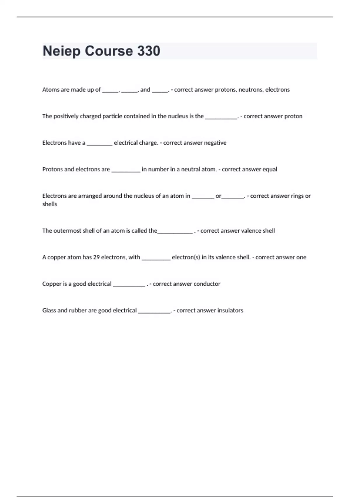 Neiep Course 330Atoms are made up of _____, _____, and _____. - correct answer protons, neutrons, electrons The positively charged particle contained in the nucleus is the __________. - correct answer proton Electrons have a ________ electrical charge. - correct answer negative Protons and electrons are _________ in number in a neutral atom. - correct answer equal Electrons are arranged around the nucleus of an atom in _______ or_______. - correct answer rings or shells The outermost shell of an atom is called the___________ . - correct answer valence shell A copper atom has 29 electrons, with _________ electron(s) in its valence shell. - correct answer one Copper is a good electrical __________ . - correct answer conductor Glass and rubber are good electrical __________. - correct answer insulators