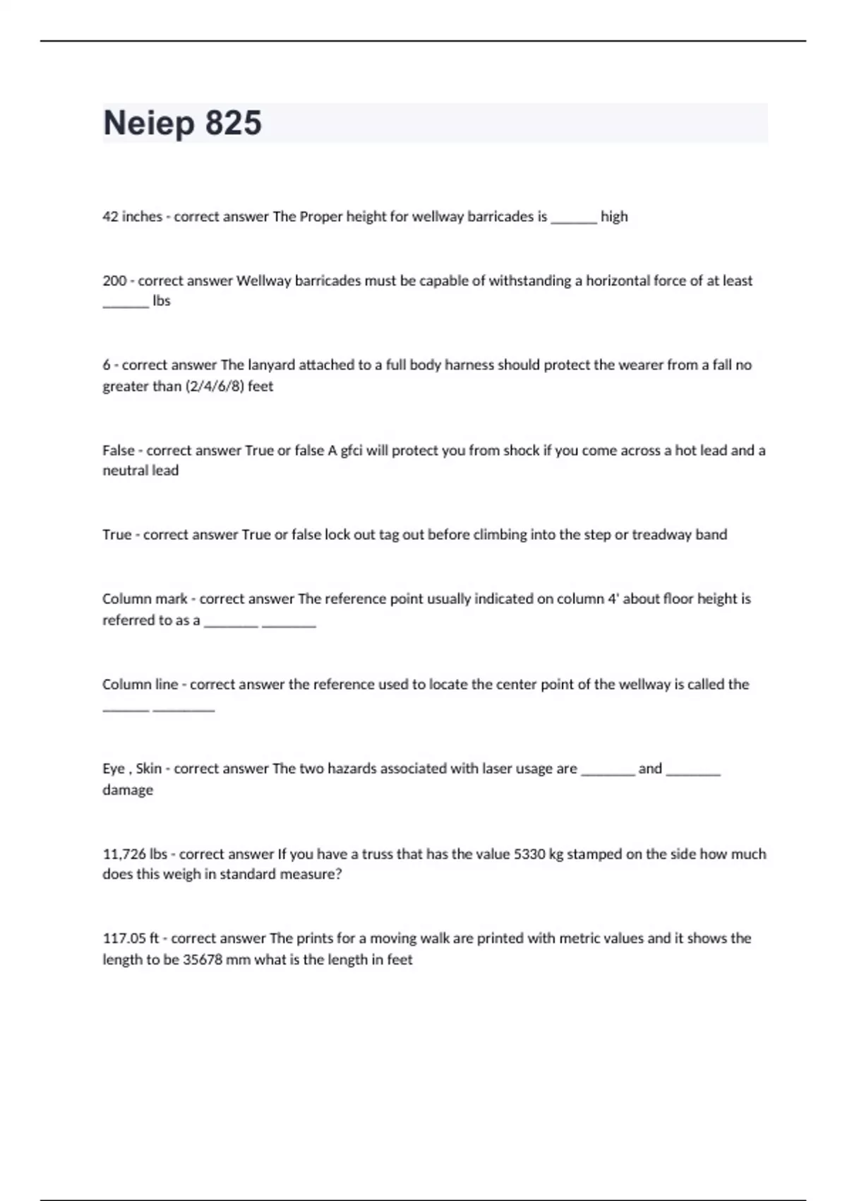 Neiep 82542 inches - correct answer The Proper height for wellway barricades is ______ high 200 - correct answer Wellway barricades must be capable of withstanding a horizontal force of at least ______ lbs 6 - correct answer The lanyard attached to a full body harness should protect the wearer from a fall no greater than (2/4/6/8) feet False - correct answer True or false A gfci will protect you from shock if you come across a hot lead and a neutral lead True - correct answer True or false lock out tag out before climbing into the step or treadway band Column mark - correct answer The reference point usually indicated on column 4' about floor height is referred to as a _______ _______ Column line - correct answer the reference used to locate the center point of the wellway is called the ______ ________ Eye , Skin - correct answer The two hazards associated with laser usage are _______ and _______ damage 11,726 lbs - correct answer If you have a truss that has the value 5330 kg stamped on the side how much does this weigh in standard measure? 117.05 ft - correct answer The prints for a moving walk are printed with metric values and it shows the length to be 35678 mm what is the length in feet