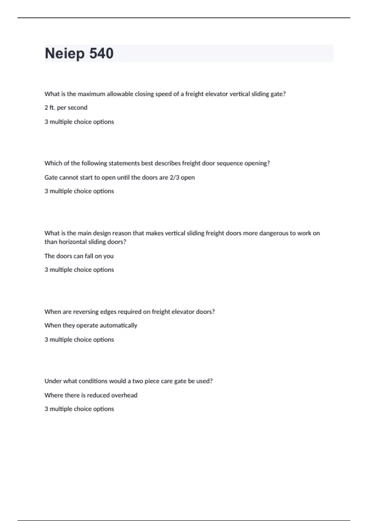 Neiep 540What is the maximum allowable closing speed of a freight elevator vertical sliding gate? 2 ft. per second 3 multiple choice options Which of the following statements best describes freight door sequence opening? Gate cannot start to open until the doors are 2/3 open 3 multiple choice options What is the main design reason that makes vertical sliding freight doors more dangerous to work on than horizontal sliding doors? The doors can fall on you 3 multiple choice options When are reversing edges required on freight elevator doors? When they operate automatically 3 multiple choice options Under what conditions would a two piece care gate be used? Where there is reduced overhead 3 multiple choice options