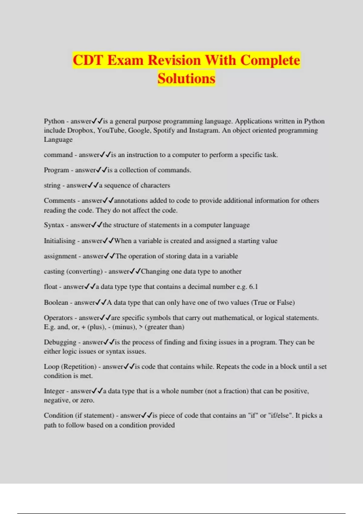 CDT Exam Revision With Complete Solutions Python - answeris a general purpose programming language. Applications written in Python include Dropbox, YouTube, Google, Spotify and Instagram. An object oriented programming Language command - answeris an instruction to a computer to perform a specific task. Program - answeris a collection of commands. string - answera sequence of characters Comments - answerannotations added to code to provide additional information for others reading the code. They do not affect the code. Syntax - answerthe structure of statements in a computer language Initialising - answerWhen a variable is created and assigned a starting value assignment - answerThe operation of storing data in a variable casting (converting) - answerChanging one data type to another float - answera data type type that contains a decimal number e.g. 6.1 Boolean - answerA data type that can only have one of two values (True or False) Operators - answerare specific symbols that carry out mathematical, or logical statements. E.g. and, or, + (plus), - (minus), > (greater than) Debugging - answeris the process of finding and fixing issues in a program. They can be either logic issues or syntax issues. Loop (Repetition) - answeris code that contains while. Repeats the code in a block until a set condition is met. Integer - answera data type that is a whole number (not a fraction) that can be positive,