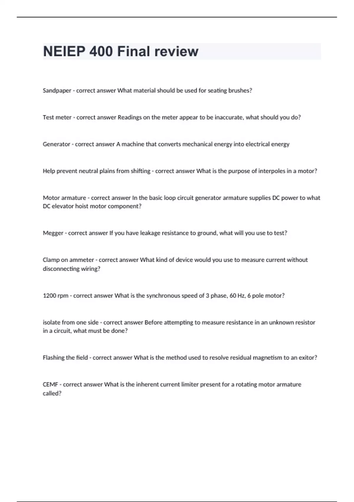 NEIEP 400 Final review Sandpaper - correct answer What material should be used for seating brushes? Test meter - correct answer Readings on the meter appear to be inaccurate, what should you do? Generator - correct answer A machine that converts mechanical energy into electrical energy Help prevent neutral plains from shifting - correct answer What is the purpose of interpoles in a motor? Motor armature - correct answer In the basic loop circuit generator armature supplies DC power to what DC elevator hoist motor component? Megger - correct answer If you have leakage resistance to ground, what will you use to test? Clamp on ammeter - correct answer What kind of device would you use to measure current without disconnecting wiring? 1200 rpm - correct answer What is the synchronous speed of 3 phase, 60 Hz, 6 pole motor? isolate from one side - correct answer Before attempting to measure resistance in an unknown resistor in a circuit, what must be done? Flashing the field - correct answer What is the method used to resolve residual magnetism to an exitor? CEMF - correct answer What is the inherent current limiter present for a rotating motor armature called?
