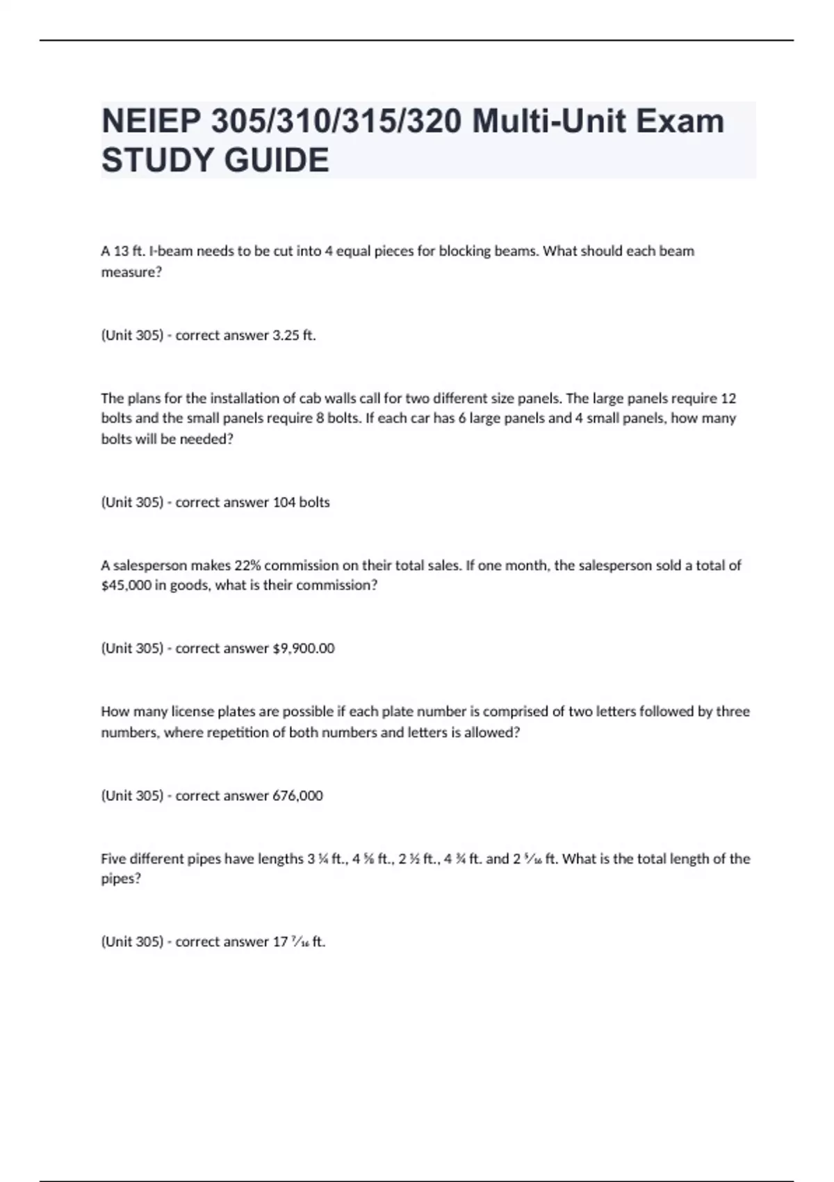 NEIEP 305/310/315/320 Multi-Unit Exam STUDY GUIDEA 13 ft. I-beam needs to be cut into 4 equal pieces for blocking beams. What should each beam measure? (Unit 305) - correct answer 3.25 ft. The plans for the installation of cab walls call for two different size panels. The large panels require 12 bolts and the small panels require 8 bolts. If each car has 6 large panels and 4 small panels, how many bolts will be needed? (Unit 305) - correct answer 104 bolts A salesperson makes 22% commission on their total sales. If one month, the salesperson sold a total of $45,000 in goods, what is their commission? (Unit 305) - correct answer $9,900.00 How many license plates are possible if each plate number is comprised of two letters followed by three numbers, where repetition of both numbers and letters is allowed? (Unit 305) - correct answer 676,000 Five different pipes have lengths 3 ¼ ft., 4 ⅝ ft., 2 ½ ft., 4 ¾ ft. and 2 5⁄16 ft. What is the total length of the pipes? (Unit 305) - correct answer 17 7⁄16 ft. The cost of the bolts used to fasten the panels in an elevator cab is $5 for 4 bolts. If a particular job calls for 80 bolts, what is the cost? (Unit 305) - correct answer $100 A shipping crate is a cube with volume 64 ft3. What is the internal height of the crate? (Unit 305) - correct answer 4 ft.