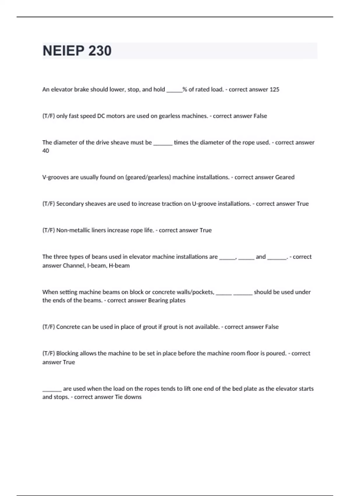 NEIEP 230An elevator brake should lower, stop, and hold _____% of rated load. - correct answer 125 (T/F) only fast speed DC motors are used on gearless machines. - correct answer False The diameter of the drive sheave must be ______ times the diameter of the rope used. - correct answer 40 V-grooves are usually found on (geared/gearless) machine installations. - correct answer Geared (T/F) Secondary sheaves are used to increase traction on U-groove installations. - correct answer True (T/F) Non-metallic liners increase rope life. - correct answer True The three types of beans used in elevator machine installations are _____, _____ and ______. - correct answer Channel, I-beam, H-beam When setting machine beams on block or concrete walls/pockets, _____ ______ should be used under the ends of the beams. - correct answer Bearing plates (T/F) Concrete can be used in place of grout if grout is not available. - correct answer False (T/F) Blocking allows the machine to be set in place before the machine room floor is poured. - correct answer True ______ are used when the load on the ropes tends to lift one end of the bed plate as the elevator starts and stops. - correct answer Tie downs