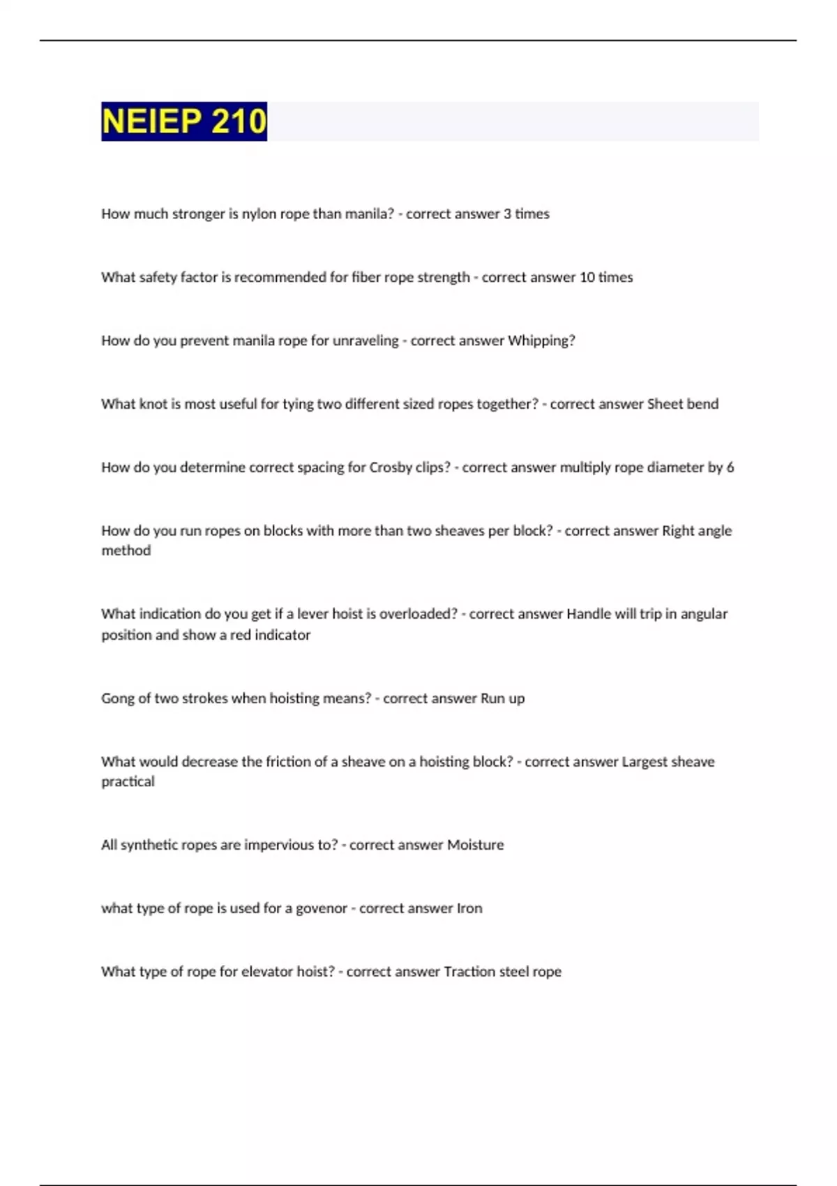 NEIEP 210How much stronger is nylon rope than manila? - correct answer 3 times What safety factor is recommended for fiber rope strength - correct answer 10 times How do you prevent manila rope for unraveling - correct answer Whipping? What knot is most useful for tying two different sized ropes together? - correct answer Sheet bend How do you determine correct spacing for Crosby clips? - correct answer multiply rope diameter by 6 How do you run ropes on blocks with more than two sheaves per block? - correct answer Right angle method What indication do you get if a lever hoist is overloaded? - correct answer Handle will trip in angular position and show a red indicator Gong of two strokes when hoisting means? - correct answer Run up What would decrease the friction of a sheave on a hoisting block? - correct answer Largest sheave practical All synthetic ropes are impervious to? - correct answer Moisture what type of rope is used for a govenor - correct answer Iron What type of rope for elevator hoist? - correct answer Traction steel rope