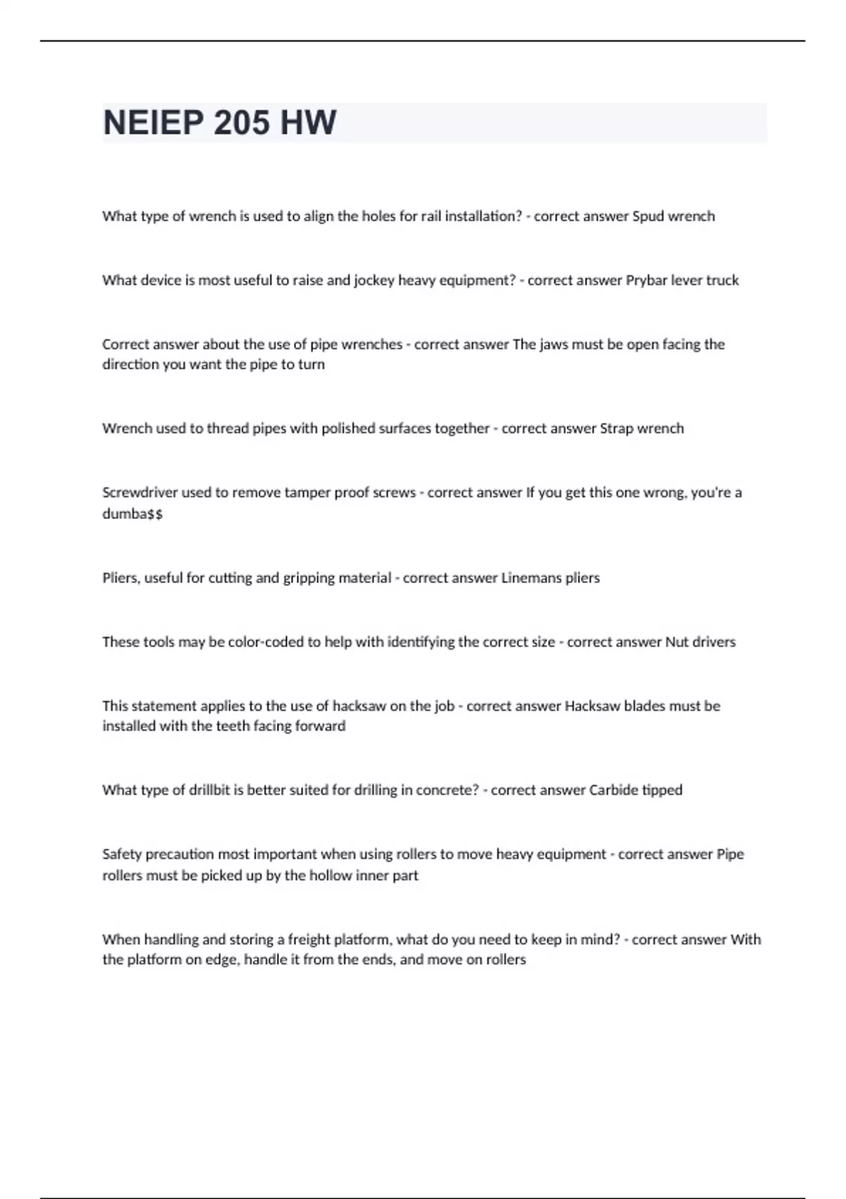 NEIEP 205 HWWhat type of wrench is used to align the holes for rail installation? - correct answer Spud wrench What device is most useful to raise and jockey heavy equipment? - correct answer Prybar lever truck Correct answer about the use of pipe wrenches - correct answer The jaws must be open facing the direction you want the pipe to turn Wrench used to thread pipes with polished surfaces together - correct answer Strap wrench Screwdriver used to remove tamper proof screws - correct answer If you get this one wrong, you're a dumba$$ Pliers, useful for cutting and gripping material - correct answer Linemans pliers These tools may be color-coded to help with identifying the correct size - correct answer Nut drivers This statement applies to the use of hacksaw on the job - correct answer Hacksaw blades must be installed with the teeth facing forward What type of drillbit is better suited for drilling in concrete? - correct answer Carbide tipped Safety precaution most important when using rollers to move heavy equipment - correct answer Pipe rollers must be picked up by the hollow inner part When handling and storing a freight platform, what do you need to keep in mind? - correct answer With the platform on edge, handle it from the ends, and move on rollers