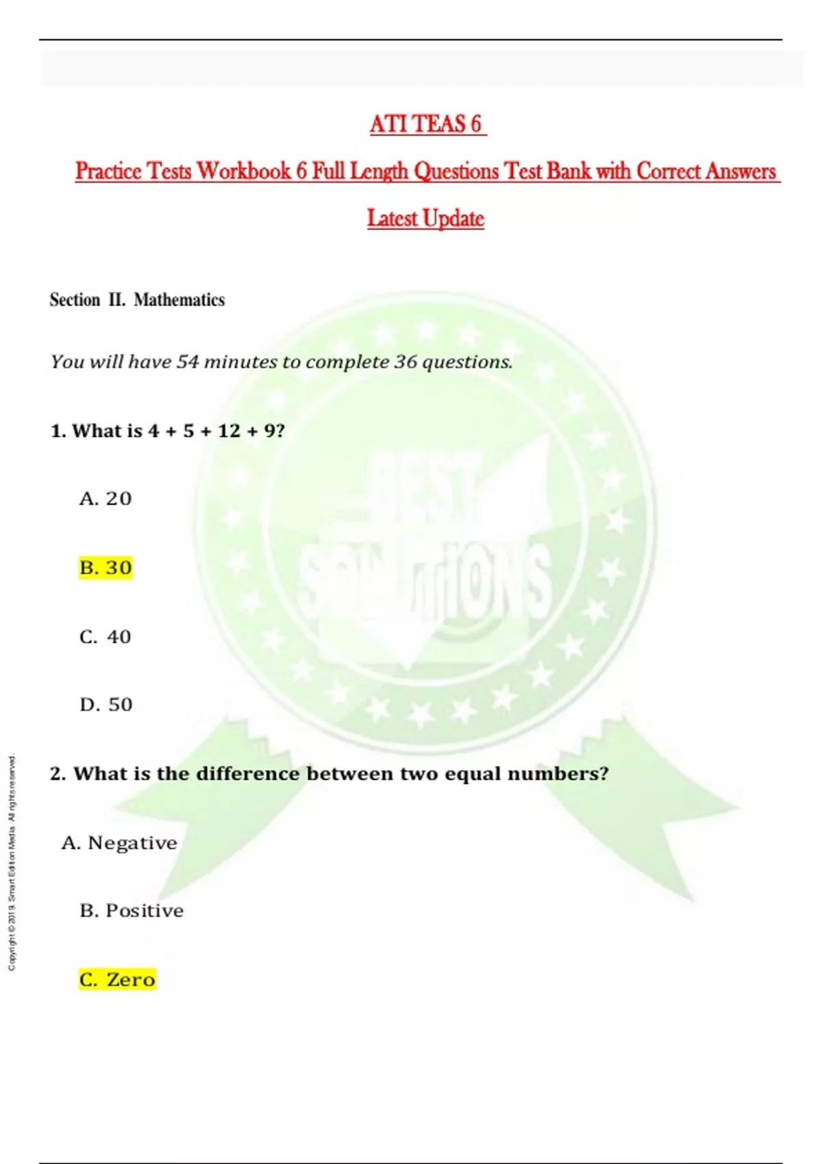 ATI TEAS 6 Practice Tests Workbook 6 Full Length Questions Test Bank with Correct Answers Latest Update Section II. Mathematics You will have 54 minutes to complete 36 questions. 1. What is 4 + 5 + 12 + 9? A. 20 B. 30 C. 40 D. 50 2. What is the difference between two equal numbers? A. Negative B. Positive C. Zero Copyright © 2019. Smart Edition Media. All rights reserved. D. Not enough information 3. Which decimal is the least? A. 2.22 B. 2.02 C. 2.002 D. 2.2 4. What is the difference between two negative numbers?