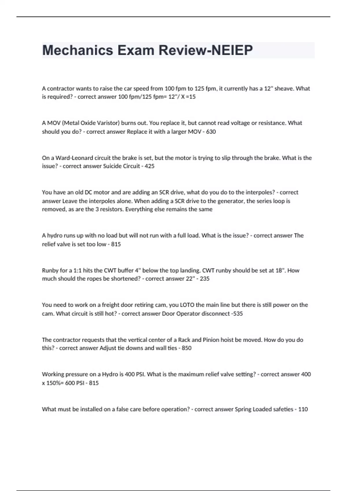 Elevator Mechanic Exam Review 2024/2025 questions and answers
