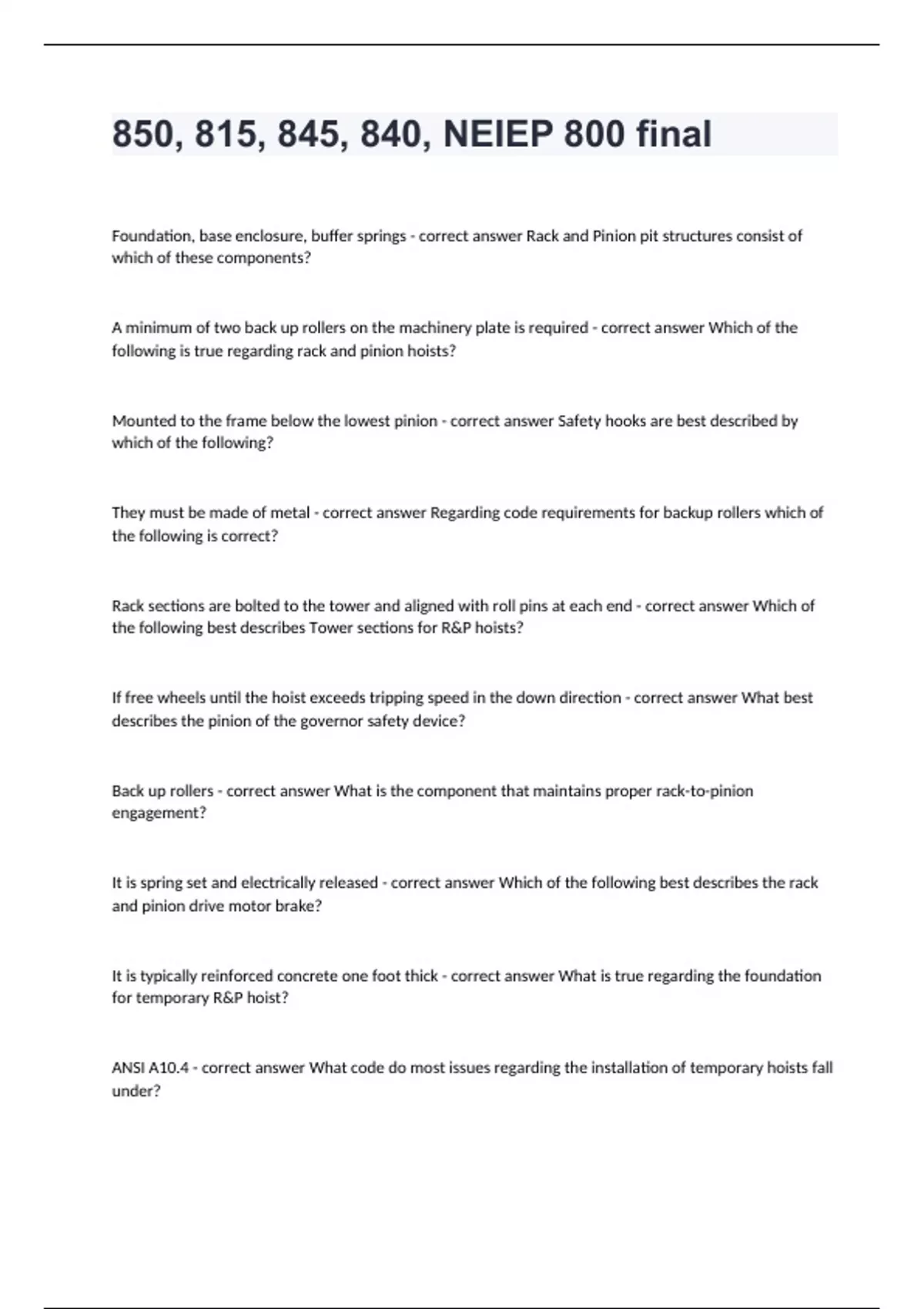 850, 815, 845, 840, NEIEP 800 final Foundation, base enclosure, buffer springs - correct answer Rack and Pinion pit structures consist of which of these components? A minimum of two back up rollers on the machinery plate is required - correct answer Which of the following is true regarding rack and pinion hoists? Mounted to the frame below the lowest pinion - correct answer Safety hooks are best described by which of the following? They must be made of metal - correct answer Regarding code requirements for backup rollers which of the following is correct? Rack sections are bolted to the tower and aligned with roll pins at each end - correct answer Which of the following best describes Tower sections for R&P hoists? If free wheels until the hoist exceeds tripping speed in the down direction - correct answer What best describes the pinion of the governor safety device? Back up rollers - correct answer What is the component that maintains proper rack-to-pinion engagement? It is spring set and electrically released - correct answer Which of the following best describes the rack and pinion drive motor brake? It is typically reinforced concrete one foot thick - correct answer What is true regarding the foundation for temporary R&P hoist? ANSI A10.4 - correct answer What code do most issues regarding the installation of temporary hoists fall under?