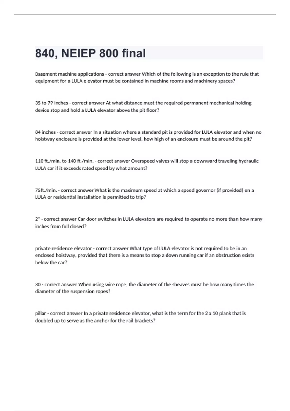 840, NEIEP 800 final Basement machine applications - correct answer Which of the following is an exception to the rule that equipment for a LULA elevator must be contained in machine rooms and machinery spaces? 35 to 79 inches - correct answer At what distance must the required permanent mechanical holding device stop and hold a LULA elevator above the pit floor? 84 inches - correct answer In a situation where a standard pit is provided for LULA elevator and when no hoistway enclosure is provided at the lower level, how high of an enclosure must be around the pit? 110 ft./min. to 140 ft./min. - correct answer Overspeed valves will stop a downward traveling hydraulic LULA car if it exceeds rated speed by what amount? 75ft./min. - correct answer What is the maximum speed at which a speed governor (if provided) on a LULA or residential installation is permitted to trip? 2" - correct answer Car door switches in LULA elevators are required to operate no more than how many inches from full closed? private residence elevator - correct answer What type of LULA elevator is not required to be in an enclosed hoistway, provided that there is a means to stop a down running car if an obstruction exists below the car? 30 - correct answer When using wire rope, the diameter of the sheaves must be how many times the diameter of the suspension ropes? pillar - correct answer In a private residence elevator, what is the term for the 2 x 10 plank that is doubled up to serve as the anchor for the rail brackets?
