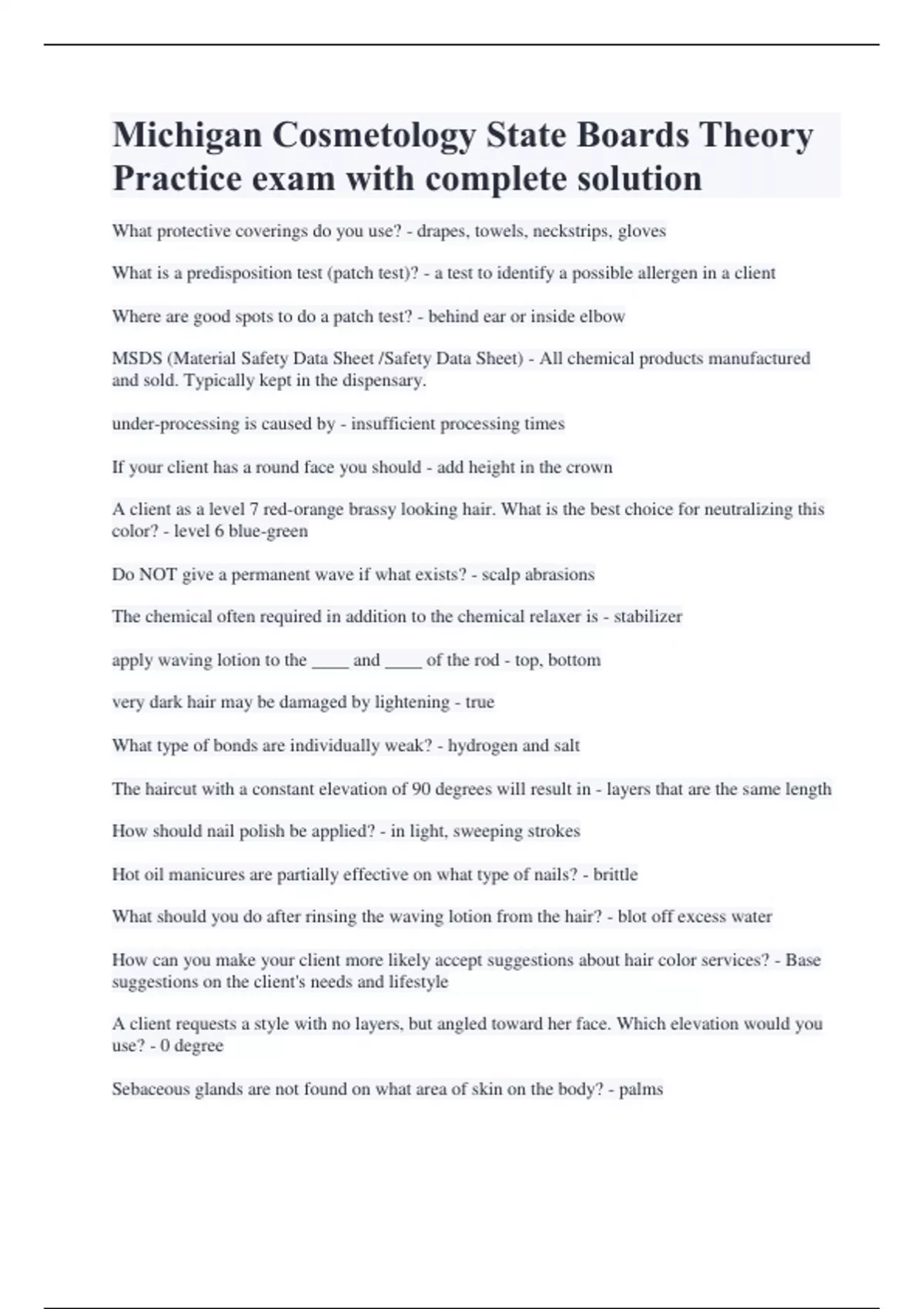 Michigan Cosmetology State Boards Theory Practice exam with complete solution What protective coverings do you use? - drapes, towels, neckstrips, gloves What is a predisposition test (patch test)? - a test to identify a possible allergen in a client Where are good spots to do a patch test? - behind ear or inside elbow MSDS (Material Safety Data Sheet /Safety Data Sheet) - All chemical products manufactured and sold. Typically kept in the dispensary. under-processing is caused by - insufficient processing times If your client has a round face you should - add height in the crown A client as a level 7 red-orange brassy looking hair. What is the best choice for neutralizing this color? - level 6 blue-green Do NOT give a permanent wave if what exists? - scalp abrasions The chemical often required in addition to the chemical relaxer is - stabilizer apply waving lotion to the ____ and ____ of the rod - top, bottom very dark hair may be damaged by lightening - true What type of bonds are individually weak? - hydrogen and salt The haircut with a constant elevation of 90 degrees will result in - layers that are the same length How should nail polish be applied? - in light, sweeping strokes Hot oil manicures are partially effective on what type of nails? - brittle What should you do after rinsing the waving lotion from the hair? - blot off excess water How can you make your client more likely accept suggestions about hair color services? - Base suggestions on the client's needs and lifestyle A client requests a style with no layers, but angled toward her face. Which elevation would you use? - 0 degree Sebaceous glands are not found on what area of skin on the body? - palms What should you do when you chemically relax a client's hair with a "no base" relaxer? - apply protective cream to the hairline and ears Can lice be safely treated in the salon? - No Which layer of the skin contains the melanocytes that give skin its color? - stratum germinativum layer What is the pH range of a sodium hydroxide relaxer? - 12 to 14 What does grasping a single strand of hair securely in one hand and then sliding the thumb and forefinger of the other hand down the strand toward the scalp is used to test the hair for? - porosity What does the pH scale measure a substance for? - if a substance is acidic, alkaline, or neutral What should you do when retouching a client's hair with a sodium hydroxide relaxer? - relax the new growth only What is trichology the study of? - hair What is the cell reproducer of the nail? - matrix What happens to each individual hair strand when an aniline derivative (oxidation) tint is mixed with hydrogen peroxide and applied to the hair? - the cortex swells allowing pigment molecules to enter What is a problem due to an over-production of sebum? - seborrhea