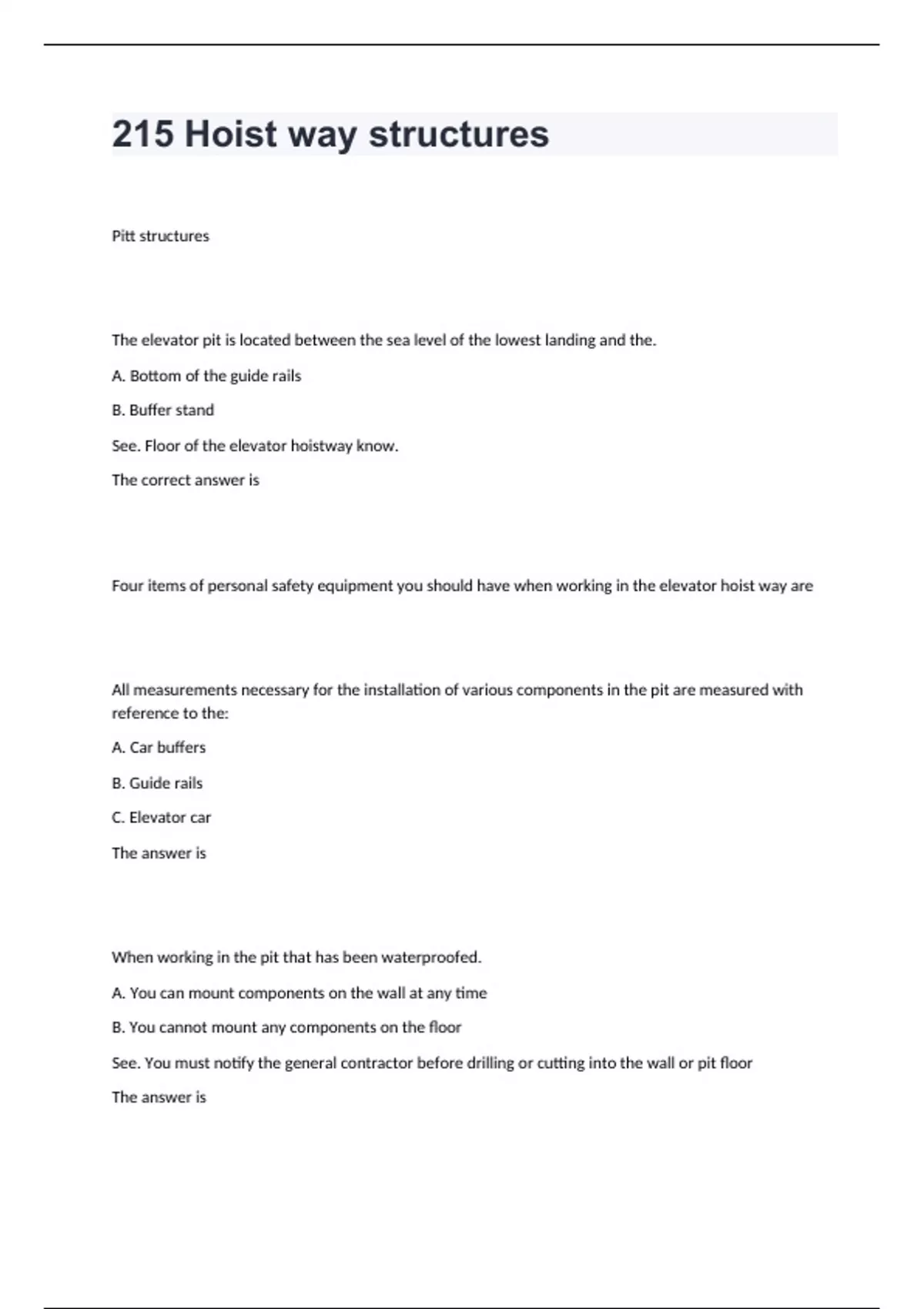 215 Hoist way structuresPitt structures The elevator pit is located between the sea level of the lowest landing and the. A. Bottom of the guide rails B. Buffer stand See. Floor of the elevator hoistway know. The correct answer is Four items of personal safety equipment you should have when working in the elevator hoist way are All measurements necessary for the installation of various components in the pit are measured with reference to the: A. Car buffers B. Guide rails C. Elevator car The answer is When working in the pit that has been waterproofed. A. You can mount components on the wall at any time B. You cannot mount any components on the floor See. You must notify the general contractor before drilling or cutting into the wall or pit floor The answer is