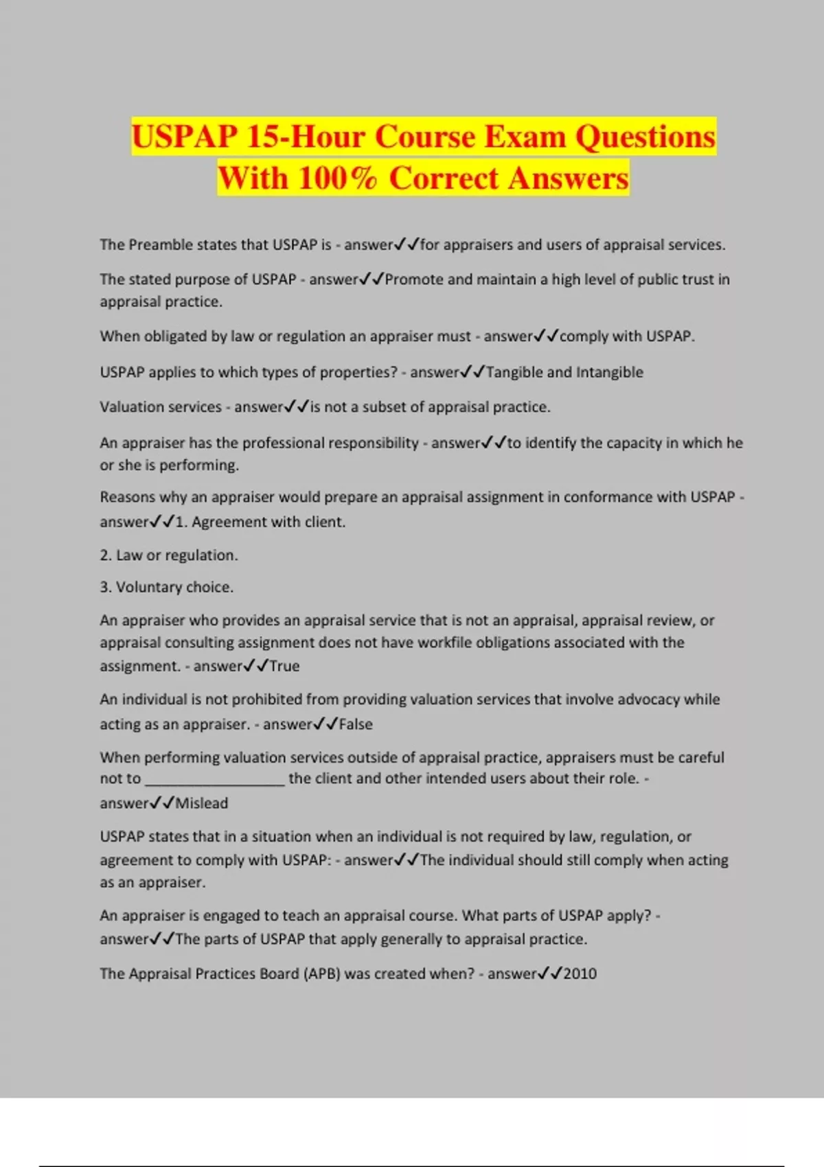 USPAP 15-Hour Course Exam Questions With 100% Correct Answers The Preamble states that USPAP is - answerfor appraisers and users of appraisal services. The stated purpose of USPAP - answerPromote and maintain a high level of public trust in appraisal practice. When obligated by law or regulation an appraiser must - answercomply with USPAP. USPAP applies to which types of properties? - answerTangible and Intangible Valuation services - answeris not a subset of appraisal practice. An appraiser has the professional responsibility - answerto identify the capacity in which he or she is performing. Reasons why an appraiser would prepare an appraisal assignment in conformance with USPAP - answer1. Agreement with client. 2. Law or regulation. 3. Voluntary choice. An appraiser who provides an appraisal service that is not an appraisal, appraisal review, or appraisal consulting assignment does not have workfile obligations associated with the assignment. - answerTrue An individual is not prohibited from providing valuation services that involve advocacy while acting as an appraiser. - answerFalse When performing valuation services outside of appraisal practice, appraisers must be careful not to _________________ the client and other intended users about their role. - answerMislead USPAP states that in a situation when an individual is not required by law, regulation, or agreement to comply with USPAP: - answerThe individual should still comply when acting as an appraiser. An appraiser is engaged to teach an appraisal course. What parts of USPAP apply? - answerThe parts of USPAP that apply generally to appraisal practice. The Appraisal Practices Board (APB) was created when? - answer2010 The APB is a(n) - answerindependent board. Boards within The Appraisal Foundation (TAF) - answer1. Board of Trustees (BOT) 2. Appraisal Standards Board (ASB) 3. Appraisal Qualifications Board (AQB) 4. Appraisal Practices Board (APB) APB is a - answerprivate entity. The APB has authority to enforce the requirements of USPAP. - answerFalse Who has the only jurisdiction and authority over appraisers? - answerStates ASB - answerDevelops, interprets, and amends USPAP. Advisory opinions - answerNot part of USPAP; reference material only. APB - answerGuidance is voluntary. ASC - answerMaintains the official National Registry of state certified and licensed appraisers. State appraisal regulatory committees - answerresponsible for issuing credentials to individual appraisers. Responsibilities of ASC: - answer• Establishes, improves, and promulgates the USPAP • Subject, content, and substance of USPAP and other communication related to appraisal standards. • Establishes standards of professional appraisal practice for the guidance and education of appraisers and users of appraisal services. • Maintains the official National Registry of state certified and licensed appraisers. Developing, amending, and interpreting USPAP is NOT a responsibility of - answerASC 12. USPAP divides the appraisal process into two distinct types of activity: - answerDevelop and report Identify the problem - answerThe first step in the appraisal process. Communication - answerThe reporting process involves ________________ of the appraiser's opinions and conclusions.