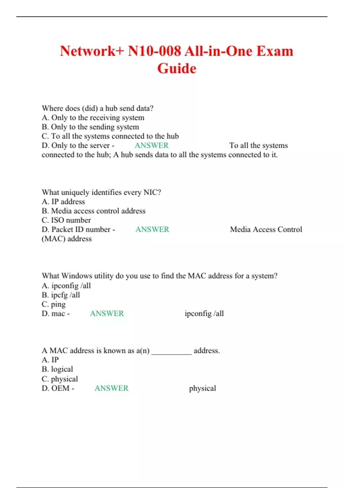 Network+ N10-008 All-in-One Exam Guide Where does (did) a hub send data? A. Only to the receiving system B. Only to the sending system C. To all the systems connected to the hub D. Only to the server - ANSWER To all the systems connected to the hub; A hub sends data to all the systems connected to it. What uniquely identifies every NIC? A. IP address B. Media access control address C. ISO number D. Packet ID number - ANSWER Media Access Control (MAC) address What Windows utility do you use to find the MAC address for a system? A. ipconfig /all B. ipcfg /all C. ping D. mac - ANSWER ipconfig /all A MAC address is known as a(n) __________ address. A. IP B. logical C. physical D. OEM - ANSWER physical A NIC sends data in discrete chunks called __________. A. segments B. sections C. frames D. layers - ANSWER frames; Data is sent in discrete chunks called frames. Networks use frames to keep any one NIC from hogging the wire. The MAC address of which of the following begins a frame? A. Receiving system B. Sending system C. Network D. Router - ANSWER Receiving system; The frame begins with the MAC address of the receiving NIC, followed by the MAC address of the sending NIC, followed, in turn, by type of encapsulated data, the data, and FCS.