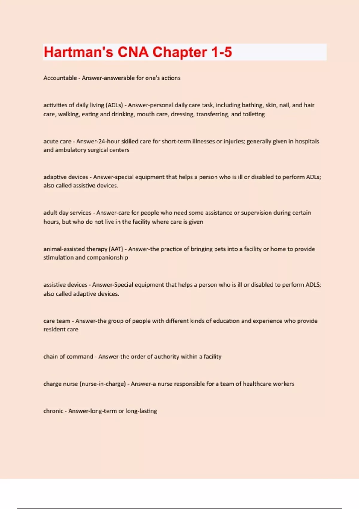 Accountable - Answer-answerable for one's actions activities of daily living (ADLs) - Answer-personal daily care task, including bathing, skin, nail, and hair care, walking, eating and drinking, mouth care, dressing, transferring, and toileting acute care - Answer-24-hour skilled care for short-term illnesses or injuries; generally given in hospitals and ambulatory surgical centers adaptive devices - Answer-special equipment that helps a person who is ill or disabled to perform ADLs; also called assistive devices. adult day services - Answer-care for people who need some assistance or supervision during certain hours, but who do not live in the facility where care is given animal-assisted therapy (AAT) - Answer-the practice of bringing pets into a facility or home to provide stimulation and companionship assistive devices - Answer-Special equipment that helps a person who is ill or disabled to perform ADLS; also called adaptive devices. care team - Answer-the group of people with different kinds of education and experience who provide resident care chain of command - Answer-the order of authority within a facility charge nurse (nurse-in-charge) - Answer-a nurse responsible for a team of healthcare workers chronic - Answer-long-term or long-lastingcite - Answer-in a long-term care facility, to find a problem through a survey conscientious - Answer-guided by a sense of right and wrong; principled continuity of care - Answer-an ongoing coordination of a resident's care over time, during which the care team is regularly exchanging information and is working toward shared goals courteous - Answer-polite, kind, considerate Delegation - Answer-transferring responsibility to a person for a specific task Dementia - Answer-the serious loss of mental abilities, such as thinking, remembering, reasoning, and communicating diagnosis - Answer-the identification of disease or other problems by its signs and symptoms and from the results of different tests empathetic - Answer-identifying with and understanding another's feelings first impression - Answer-a way of classifying or categorizing someone or something at the first meeting functional nursing - Answer-method of care that involves assigning specific tasks to each team member holistic care - Answer-care that involves the whole person; this includes his or her physical, social, emotional, and spiritual needs home health care - Answer-care that takes place in a person's home hospice care - Answer-care for people who have approximately six months or less to live; care is available until the person diesinter-generational care - Answer-mixing elderly and children in the same care setting Joint Commission - Answer-a not-for-profit organization that evaluates and accredits different types of healthcare facilities length of stay - Answer-the number of days a person stays in a healthcare facility liability - Answer-a legal term that means someone can be held responsible for harming someone else Licensed Practical Nurse (LPN) or licensed vocational nurse (LVN) - Answer-a licensed nurse who administers medications, gives treatment, and may supervise daily care of residents long term care - Answer-24-hour care provided for people with ongoing conditions who are generally unable to manage their ADLs Medicaid - Answer-a medical assistance program for low-income people, as well as for people with disabilities Medicare - Answer-the federal health insurance program for people who are 65 or older, are disabled or are ill and cannot work Medicare Part A - Answer-helps pay for care in a hospital or skilled nursing facility or for care from a home health agency or hospice Medicare Part B - Answer-helps pay for doctor services and other medical services and equipment Medicare Part C - Answer-combines insurance