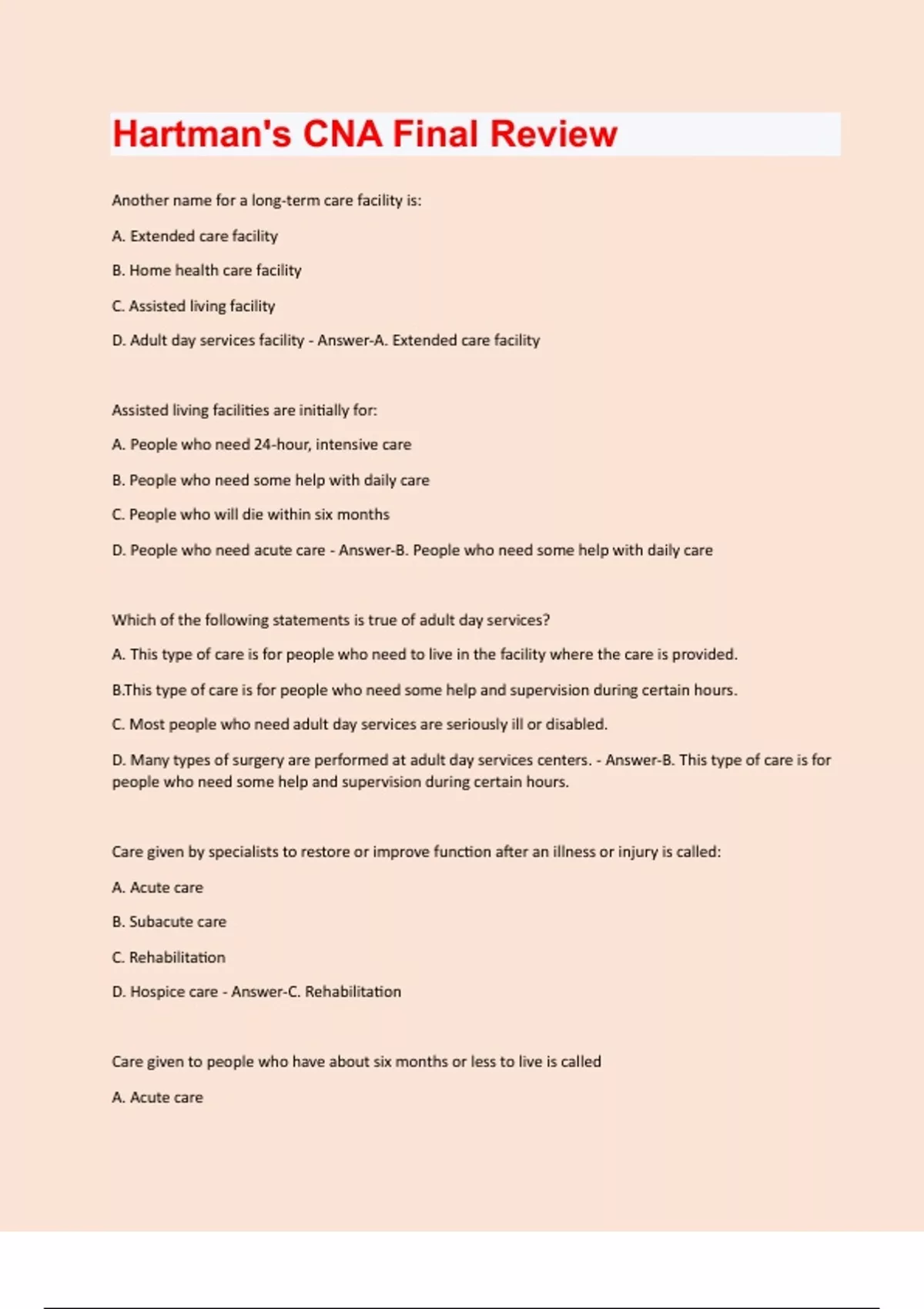 Another name for a long-term care facility is: A. Extended care facility B. Home health care facility C. Assisted living facility D. Adult day services facility - Answer-A. Extended care facility Assisted living facilities are initially for: A. People who need 24-hour, intensive care B. People who need some help with daily care C. People who will die within six months D. People who need acute care - Answer-B. People who need some help with daily care Which of the following statements is true of adult day services? A. This type of care is for people who need to live in the facility where the care is provided. B.This type of care is for people who need some help and supervision during certain hours. C. Most people who need adult day services are seriously ill or disabled. D. Many types of surgery are performed at adult day services centers. - Answer-B. This type of care is for people who need some help and supervision during certain hours. Care given by specialists to restore or improve function after an illness or injury is called: A. Acute care B. Subacute care C. Rehabilitation D. Hospice care - Answer-C. Rehabilitation Care given to people who have about six months or less to live is called A. Acute careB. Subacute care C. Rehabilitative care D. Hospice care - Answer-D. Hospice care People who live in long-term care facilities are usually called____________ because it is where they live for the duration of their stay. A. Patients B. Healthcare providers C. Regulators D. Residents - Answer-D. Residents Two groups of people who qualify for Medicare are A. Sick & Elderly B. Elderly & Disabled C. Young Children & Infants - Answer-B. Elderly & Disabled There are four parts of Medicare, what does part A help pay for? A. Liability B. Medication C. Hospital/Nursing Home - Answer-C. Hospital/Nursing Home There are four parts of Medicare, what does part B help pay for? A.ADLs B. Other insurance C. Doctor's Office/Equipment - Answer-C. Doctor's Office/Equipment There are four parts of Medicare, what does part C help pay for? A.Other Insurance B. TrainingC. Health Info - Answer-A. Other Insurance There are four parts of Medicare, what does part D help pay for? A. Nursing Home B. Prescription Medication C. Equipment - Answer-B.Prescription/Medicine Nursing assistants will help with_____ care, such as bathing and hair care. A. Basic B. Personal C. Oral D. Eye - Answer-B. Personal Nursing assistants will help with ________ needs A. Daily B. Tolieting C. Health D. Bathing - Answer-B. Tolieting Nursing assistants will help residents move around___________ A. Safely B.Carefully C. Slowly D. Evenly - Answer-A. Safely Nursing assistants will assist with _______ A. Diet B. Meals C. TolietingD. Walking - Answer-B. Meals Nursing assistants will help promote self-care and__________ A. Body image B. Independence - Answer-B. Independence Activities Director A. Helps residents socialize and stay active B. Creates diets C. Diagnoses and treats illnesses D. Help patient with social and financial issues - Answer-A.Helps residents socialize and stay active