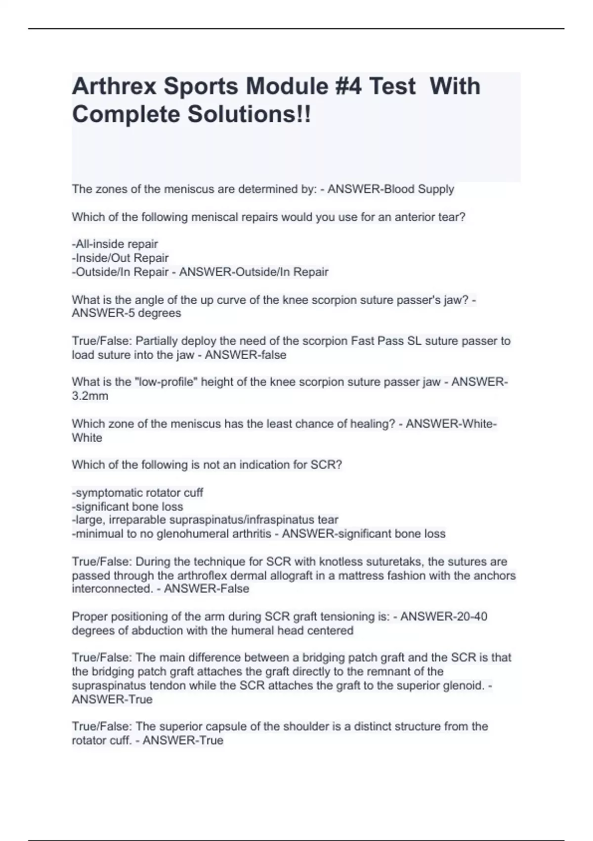 Arthrex Sports Module #4 Test With Complete Solutions!!