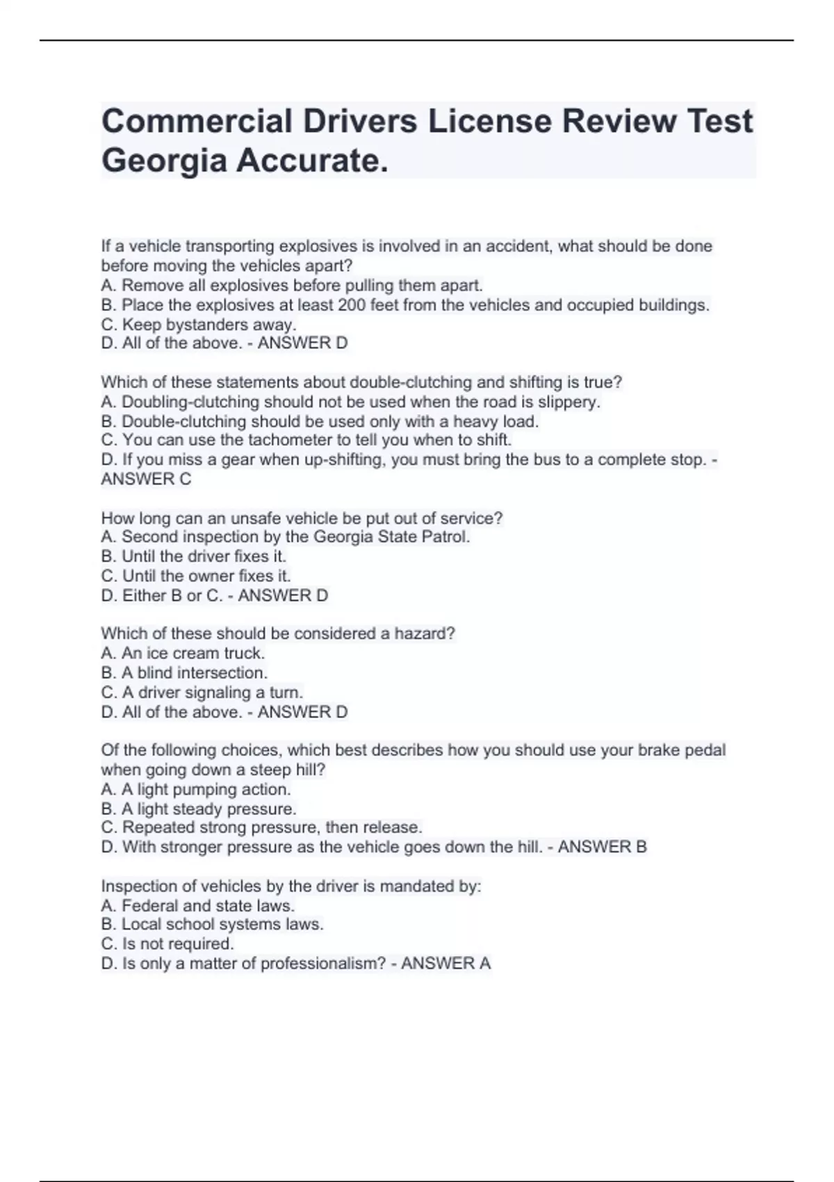 If a vehicle transporting explosives is involved in an accident, what should be done before moving the vehicles apart? A. Remove all explosives before pulling them apart. B. Place the explosives at least 200 feet from the vehicles and occupied buildings. C. Keep bystanders away. D. All of the above. - ANSWER D Which of these statements about double-clutching and shifting is true? A. Doubling-clutching should not be used when the road is slippery. B. Double-clutching should be used only with a heavy load. C. You can use the tachometer to tell you when to shift. D. If you miss a gear when up-shifting, you must bring the bus to a complete stop. - ANSWER C How long can an unsafe vehicle be put out of service? A. Second inspection by the Georgia State Patrol. B. Until the driver fixes it. C. Until the owner fixes it. D. Either B or C. - ANSWER D Which of these should be considered a hazard? A. An ice cream truck. B. A blind intersection. C. A driver signaling a turn. D. All of the above. - ANSWER D Of the following choices, which best describes how you should use your brake pedal when going down a steep hill? A. A light pumping action. B. A light steady pressure. C. Repeated strong pressure, then release. D. With stronger pressure as the vehicle goes down the hill. - ANSWER B Inspection of vehicles by the driver is mandated by: A. Federal and state laws. B. Local school systems laws. C. Is not required. D. Is only a matter of professionalism? - ANSWER A When you dim your lights at night, what should you do about your speed? A. Slow down. B. Speed up. C. Drop 5 mph until your eyes adjust. D. Nothing, because how you see should not affect your speed. - ANSWER A Of the following statements, which is true about speed? A. Empty trucks always stop easier than do fully loaded ones. B. When you go twice as fast, it will take twice as far to stop. C. You should choose a speed that will allow you to stop within the distance you can se