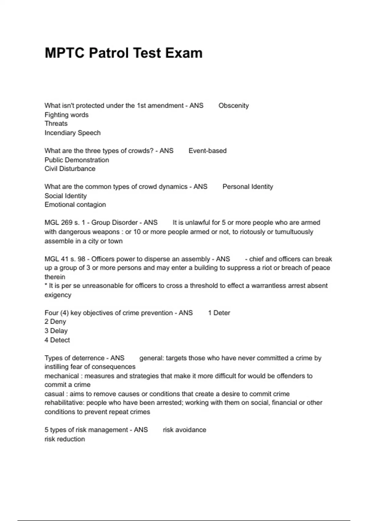 What isn't protected under the 1st amendment - ANS Obscenity Fighting words Threats Incendiary Speech What are the three types of crowds? - ANS Event-based Public Demonstration Civil Disturbance What are the common types of crowd dynamics - ANS Personal Identity Social Identity Emotional contagion MGL 269 s. 1 - Group Disorder - ANS It is unlawful for 5 or more people who are armed with dangerous weapons : or 10 or more people armed or not, to riotously or tumultuously assemble in a city or town MGL 41 s. 98 - Officers power to disperse an assembly - ANS - chief and officers can break up a group of 3 or more persons and may enter a building to suppress a riot or breach of peace therein * It is per se unreasonable for officers to cross a threshold to effect a warrantless arrest absent exigency Four (4) key objectives of crime prevention - ANS 1 Deter 2 Deny 3 Delay 4 Detect Types of deterrence - ANS general: targets those who have never committed a crime by instilling fear of consequences mechanical : measures and strategies that make it more difficult for would be offenders to commit a crime casual : aims to remove causes or conditions that create a desire to commit crime rehabilitative: people who have been arrested; working with them on social, financial or other conditions to prevent repeat crimes 5 types of risk management - ANS risk avoidance risk reduction risk spreading risk transfer