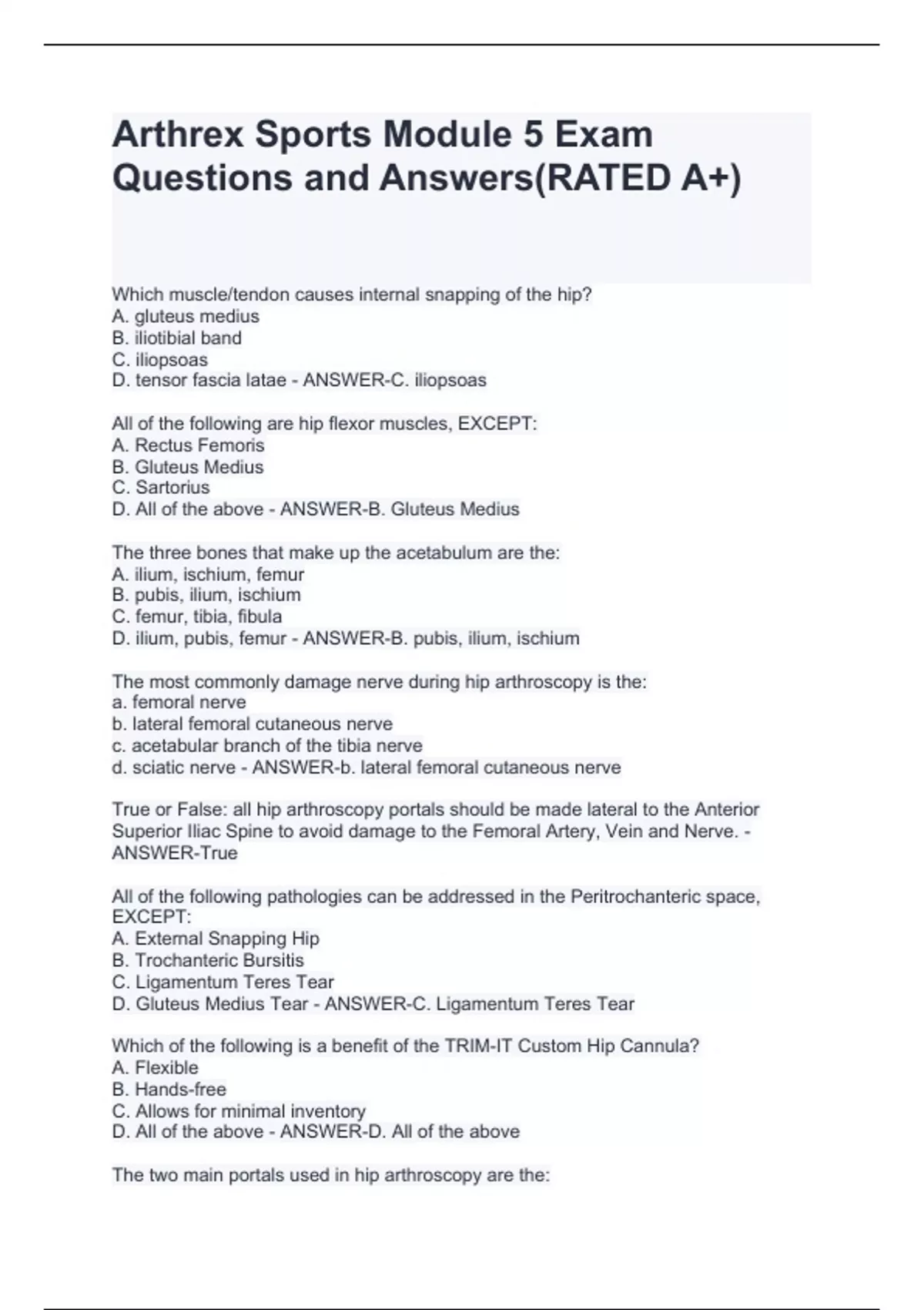All of the following are hip flexor muscles, EXCEPT: A. Rectus Femoris B. Gluteus Medius C. Sartorius D. All of the above - ANSWER-B. Gluteus Medius The three bones that make up the acetabulum are the: A. ilium, ischium, femur B. pubis, ilium, ischium C. femur, tibia, fibula D. ilium, pubis, femur - ANSWER-B. pubis, ilium, ischium The most commonly damage nerve during hip arthroscopy is the: a. femoral nerve b. lateral femoral cutaneous nerve c. acetabular branch of the tibia nerve d. sciatic nerve - ANSWER-b. lateral femoral cutaneous nerve True or False: all hip arthroscopy portals should be made lateral to the Anterior Superior Iliac Spine to avoid damage to the Femoral Artery, Vein and Nerve. - ANSWER-True All of the following pathologies can be addressed in the Peritrochanteric space, EXCEPT: A. External Snapping Hip B. Trochanteric Bursitis C. Ligamentum Teres Tear D. Gluteus Medius Tear - ANSWER-C. Ligamentum Teres Tear Which of the following is a benefit of the TRIM-IT Custom Hip Cannula? A. Flexible B. Hands-free C. Allows for minimal inventory D. All of the above - ANSWER-D. All of the above The two main portals used in hip arthroscopy are the: A. posterolateral and midanterior B. anteromedial and anterior C. anterolateral and midanterior D. posterolateral and anteromedial - ANSWER-C. anterolateral and midanterior Capsular closure in all settings is still a controversial topic but most surgeons agree that closure should be performed in which of the following surgical scenarios. A. T capsulotomy B. Labral repair C. Oversized pincer lesions D. For all FAI cases E. Ischiofemoral impingement - ANSWER-A. T capsulotomy All of the following are functions of the Acetabular Labrum, EXCEPT: A. Acts as a shock absorber, with its most thick portion superiorly B. Serves as an attachment for the Ligamentum Teres C. Adds stability to the hip by deepening the "socket" D. Provides a suction seal to the hip - ANSWER-B. Serves as an attachment for the Ligamentum Teres True or False: FAI can be defined as the repetitive abutment between the femoral neck and acetabular rim that occurs within ranges of motion which causes symptoms. - ANSWER-True In which compartment of the hip would you address a CAM lesion? A. central B. peripheral C. peritrochanteric - ANSWER-B. peripheral True or false: A CAM deformity is a bony overgrowth of the femoral neck and is associated with chondral defects on the acetabular transitional zone cartilage, while a Pincer deformity is an overgrowth of the acetabulum and is associated with "pinching" of the labrum and labral tears. - ANSWER-True Most Femoroacetabular Impingement (FAI) contains mixed Pincer/CAM lesions - ANSWER-True Cam impingement can be defined as A. An osteophyte on the top of the femoral head B. An aspherical femoral head, usually anterosuperior "aspherical extension" C. Shorthand for camshaft D. The rock in my shoe - ANSWER-An aspherical femoral head, usually anterosuperior "aspherical extension"