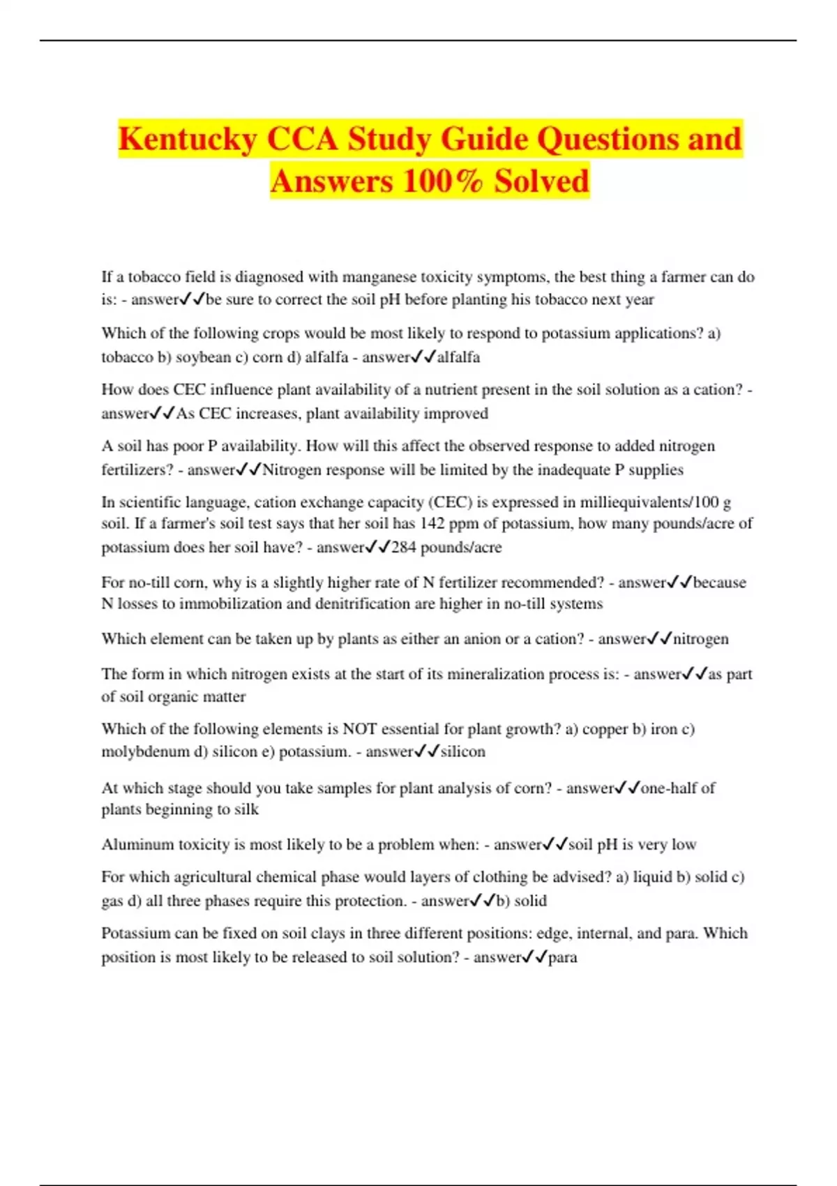 Kentucky CCA Study Guide Questions and Answers 100% Solved If a tobacco field is diagnosed with manganese toxicity symptoms, the best thing a farmer can do is: - answerbe sure to correct the soil pH before planting his tobacco next year Which of the following crops would be most likely to respond to potassium applications? a) tobacco b) soybean c) corn d) alfalfa - answeralfalfa How does CEC influence plant availability of a nutrient present in the soil solution as a cation? - answerAs CEC increases, plant availability improved A soil has poor P availability. How will this affect the observed response to added nitrogen fertilizers? - answerNitrogen response will be limited by the inadequate P supplies In scientific language, cation exchange capacity (CEC) is expressed in milliequivalents/100 g soil. If a farmer's soil test says that her soil has 142 ppm of potassium, how many pounds/acre of potassium does her soil have? - answer284 pounds/acre For no-till corn, why is a slightly higher rate of N fertilizer recommended? - answerbecause N losses to immobilization and denitrification are higher in no-till systems Which element can be taken up by plants as either an anion or a cation? - answernitrogen The form in which nitrogen exists at the start of its mineralization process is: - answeras part of soil organic matter Which of the following elements is NOT essential for plant growth? a) copper b) iron c) molybdenum d) silicon e) potassium. - answersilicon At which stage should you take samples for plant analysis of corn? - answerone-half of plants beginning to silk Aluminum toxicity is most likely to be a problem when: - answersoil pH is very low For which agricultural chemical phase would layers of clothing be advised? a) liquid b) solid c) gas d) all three phases require this protection. - answerb) solid Potassium can be fixed on soil clays in three different positions: edge, internal, and para. Which position is most likely to be released to soil solution? - answerpara Which type of clay mineral would have the highest P retention? a) amorphous clays b) oxides c) 1:1 clays d) 2:1 clays. - answeramorphous clays You see tobacco plants that are dark green, severely stunted, and have yellow flecks in lower leaves. What is the likely culprit? - answerinadequate soil phosphorus Which of the following nitrogen forms would cause the largest drop in soil pH? a) anhydrous ammonia b) ammonium nitrate c) ammonium sulfate d) calcium nitrate - answeranhydrous ammonia What factors cause ammonium in the soil to be mineralized to nitrate? - answerA pair of soil bacteria is responsible for this reaction The scenario under which banded starter fertilizer is most likely to benefit corn is: - answerno-till, early planted, low soil test The most common uptake form of potassium is as - answerK+ What is the main reason for doing plant analysis? - answerto accurately diagnose nutrient deficiencies. Which of the following statements are true about sulfur in Kentucky soils? - answerOur soils receive about 10 to 15 pounds/acre of S in rainfall every year What potassium form must tobacco growers avoid? - answerpotassium chloride If you are deciding how much P and K to apply to winter wheat, and you plan to double crop soybean the following summer, how should you decide how much P and K to apply? - answerUse the P recommendation for wheat, but use the K recommendation for soybean. How does soil pH affect P availability? - answerP is most available to plants at a pH of about 6.5. The bad thing about using urea as a nitrogen source for no-till corn is - answerit is subject to significant losses through the process of volatilization. What is the key advantage of anhydrous ammonia over other forms of nitrogen? - answerSince it has the highest analysis, it is often the least costly form of nitrogen Of the three macronutrients, which is most mobile within crop plants? - answernitrogen How many tons of ammonium nitrate (34-0-0) would be required to deliver 300 pounds of N per acre to 40 acres of tobacco? - answer17.6 Besides C, H, and O, which of the following are essential elements required in the largest amounts? - answernitrogen, phosphorus, and potassium