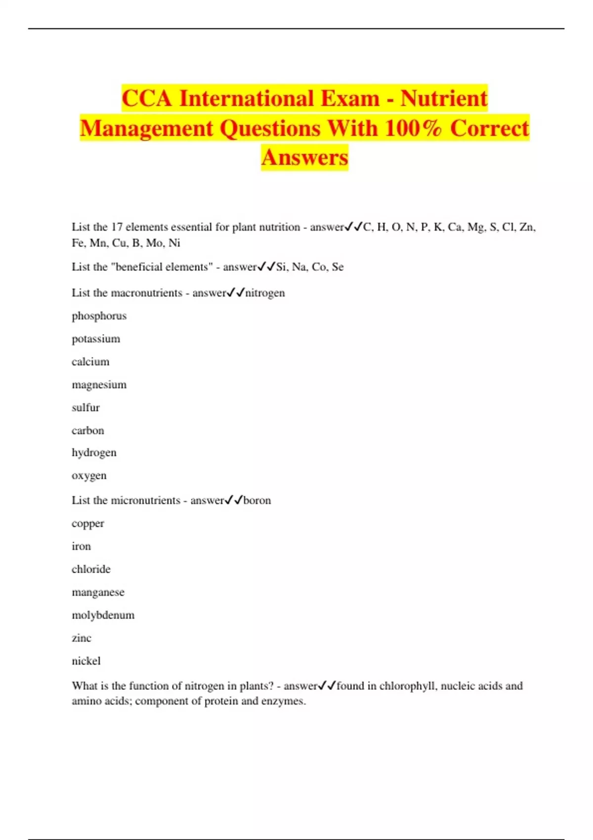 CCA International Exam - Nutrient Management Questions With 100% Correct Answers List the 17 elements essential for plant nutrition - answerC, H, O, N, P, K, Ca, Mg, S, Cl, Zn, Fe, Mn, Cu, B, Mo, Ni List the "beneficial elements" - answerSi, Na, Co, Se List the macronutrients - answernitrogen phosphorus potassium calcium magnesium sulfur carbon hydrogen oxygen List the micronutrients - answerboron copper iron chloride manganese molybdenum zinc nickel What is the function of nitrogen in plants? - answerfound in chlorophyll, nucleic acids and amino acids; component of protein and enzymes. What is the function of phosphorus in plants? - answeran essential component of DNA, RNA, and phospholipids, which play critical roles in cell membranes; also plays a major role in the energy system (ATP) of plants. What is the function of potassium in plants? - answerplays a major role in the metabolism of the plant, and is involved in photosynthesis, drought tolerance, improved winter hardiness and protein synthesis. What is the function of sulfur in plants? - answerrequired for protein synthesis; aids in seed production, producing the chlorophyll necessary for photosynthesis; necessary component of three amino acids needed for protein synthesis; required for nodule formation on root hairs of legume crops. Nitrogen: mobile or immobile in the plant? - answermobile as nitrate and ammonium (NO3 - / NH4 +) Phosphorus: mobile or immobile in the plant? - answersomewhat mobile as phosphate (H2PO4 - and HPO4 2-) Potassium: mobile or immobile in the plant? - answervery mobile (K+) Calcium: mobile or immobile in the plant? - answerimmobile (Ca 2+) Magnesium: mobile or immobile in the plant? - answersomewhat mobile (Mg 2+) Sulfur: mobile or immobile in the plant? - answermobile as (SO42-) Boron: mobile or immobile in the plant? - answerImmobile (BO3 -) Copper: mobile or immobile in the plant? - answerimmobile (Cu 2+) Iron: mobile or immobile in the plant? - answerimmobile (Fe 2+/Fe 3+) Manganese: mobile or immobile in the plant? - answerimmobile (Mn 2+) Zinc: mobile or immobile in the plant? - answerimmobile (Zn 2+) Molybdenum: mobile or immobile in the plant? - answerimmobile (MoO4 -) Chlorine: mobile or immobile in the plant? - answermobile (Cl -) Nickel: mobile or immobile in the plant? - answermobile (Ni 2+) How does nutrient uptake change as a plant progresses from germination to maturity? - answerplant nutrient needs start low while the plants are young and small, increases rapidly through vegetative growth, and then decreases again around the time of reproductive development Describe how the soil solution supplies nutrients from the soil - answersoil solution is the liquid in the soil and plant nutrients dissolved in the soil solution can move into the plant as the water is taken up. Describe how cation exchange sites supply nutrients from the soil - answerCations (Mg+, Ca+, K+) are held on negatively charged exchange sites in the soil. Describe how organic matter supplies nutrients from the soil - answerOrganic matter contains nutrients that are released for plant uptake through microbial decomposition. Describe how soil minerals supply nutrients from the soil - answerAs soil minerals (clays, carbonates, etc.) weather (breakdown) they release nutrients for plant uptake. A good example of this is potassium. Describe how plant residues supply nutrients from the soil - answerAs plant residues breakdown, the nutrients in them become available to growing plants. Nitrogen is typically the one we think of, but the other essential nutrients in plant residues will become available for plant uptake as well. Describe nutrient mineralization - answerMineralization refers to the conversion of organic N sources (plant residues, manures, and biosolids) to inorganic N sources. This is accomplished by a wide variety of microorganisms. Describe nutrient immobilization - answerImmobilization is the reverse of mineralization as this refers to the conversion of inorganic forms of nitrogen into organic forms, such as microbial cells and organic matter.. When do mineralization and immobilization occur? - answerThe same time What do C:N ratios tell us? - answerC:N 20 = net mineralization of N C:N 30 = net immobilization of N Describe uptake antagonism between ions - answerrefers to circumstances where, depending on soil conditions and nutrient form and availability, plant uptake is weighted favorably toward some nutrient(s) over others. Describe mass flow - answeroccurs when a nutrient is dissolved in the soil solution and flows with water into the plant. This is the major process for uptake of nitrogen, calcium and magnesium. Describe diffusion - answermovement of a nutrient from area of high concentration to lower concentration. Typically the nutrient will move from the soil solution (high) to the root surface (low). *important process for phosphorus and potassium; key theory behind use of banded or starter fertilizer*