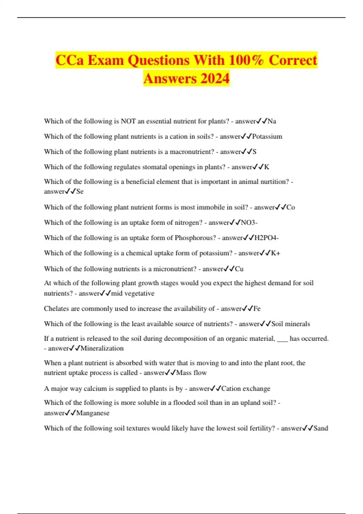 CCa Exam Questions With 100% Correct Answers 2024 Which of the following is NOT an essential nutrient for plants? - answerNa Which of the following plant nutrients is a cation in soils? - answerPotassium Which of the following plant nutrients is a macronutrient? - answerS Which of the following regulates stomatal openings in plants? - answerK Which of the following is a beneficial element that is important in animal nurtition? - answerSe Which of the following plant nutrient forms is most immobile in soil? - answerCo Which of the following is an uptake form of nitrogen? - answerNO3- Which of the following is an uptake form of Phosphorous? - answerH2PO4- Which of the following is a chemical uptake form of potassium? - answerK+ Which of the following nutrients is a micronutrient? - answerCu At which of the following plant growth stages would you expect the highest demand for soil nutrients? - answermid vegetative Chelates are commonly used to increase the availability of - answerFe Which of the following is the least available source of nutrients? - answerSoil minerals If a nutrient is released to the soil during decomposition of an organic material, ___ has occurred. - answerMineralization When a plant nutrient is absorbed with water that is moving to and into the plant root, the nutrient uptake process is called - answerMass flow A major way calcium is supplied to plants is by - answerCation exchange Which of the following is more soluble in a flooded soil than in an upland soil? - answerManganese Which of the following soil textures would likely have the lowest soil fertility? - answerSand